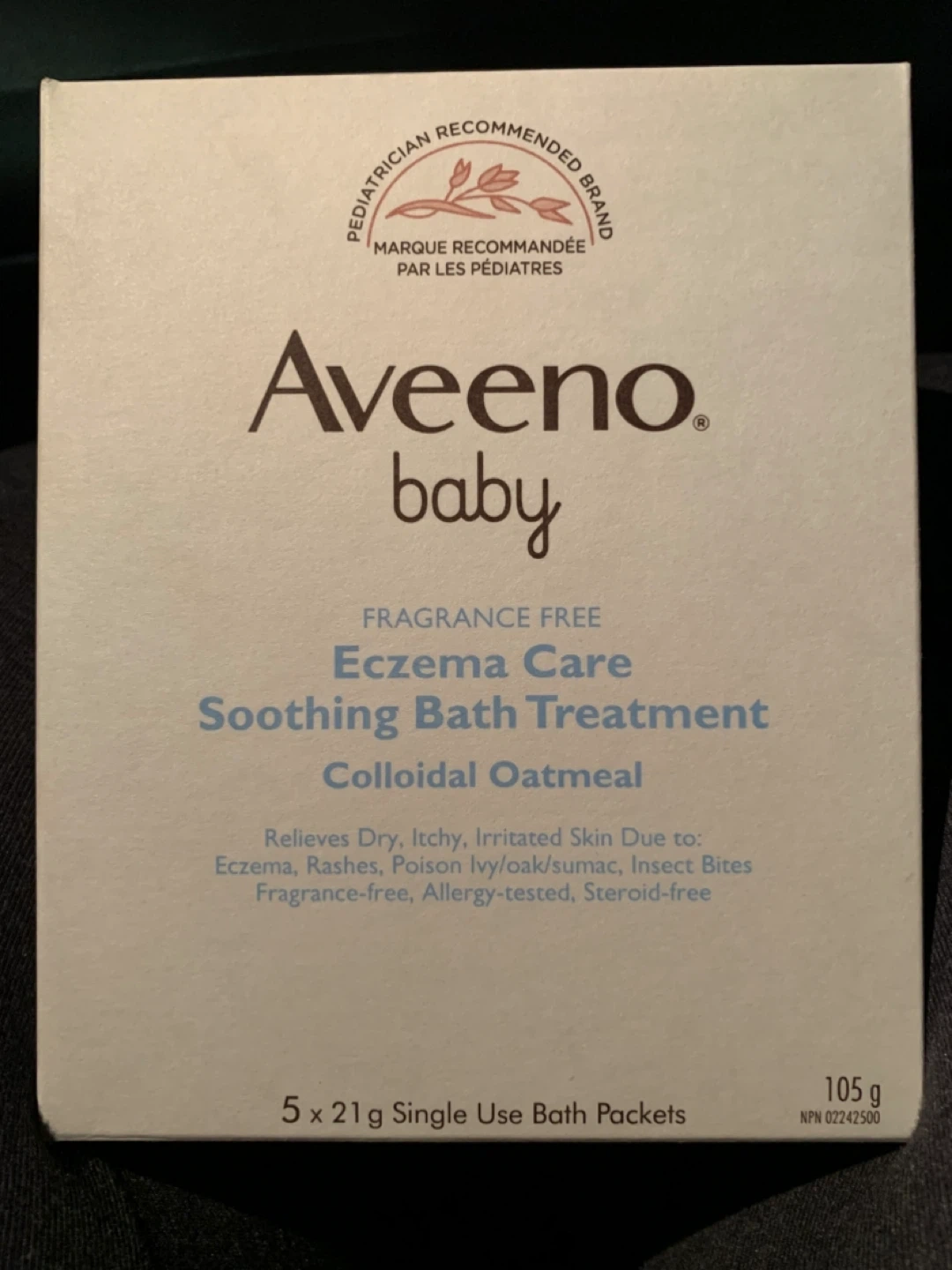 Aveeno Baby Eczema Care Soothing Bath Treatment with colloidal oatmeal. This is a fragrance-free, allergy-tested, and steroid-free formula to relieve dry, itchy, and irritated skin due to eczema, rashes, poison ivy/oak/sumac, and insect bites. Each box contains 5 x 21g single-use bath packets.