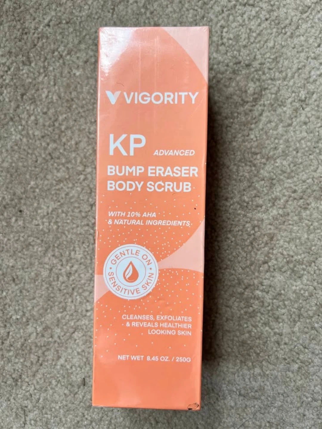56I'm selling a Vigority KP Advanced Bump Eraser Body Scrub. It's carefully formulated with 10% AHA and natural ingredients and designed for exfoliating body scrub. It gently and effectively cleanses old dead skin cells, clears pores, reduces redness, bumps, and irritation associated with Keratosis Pilaris. The net weight is 8.45 oz / 250g