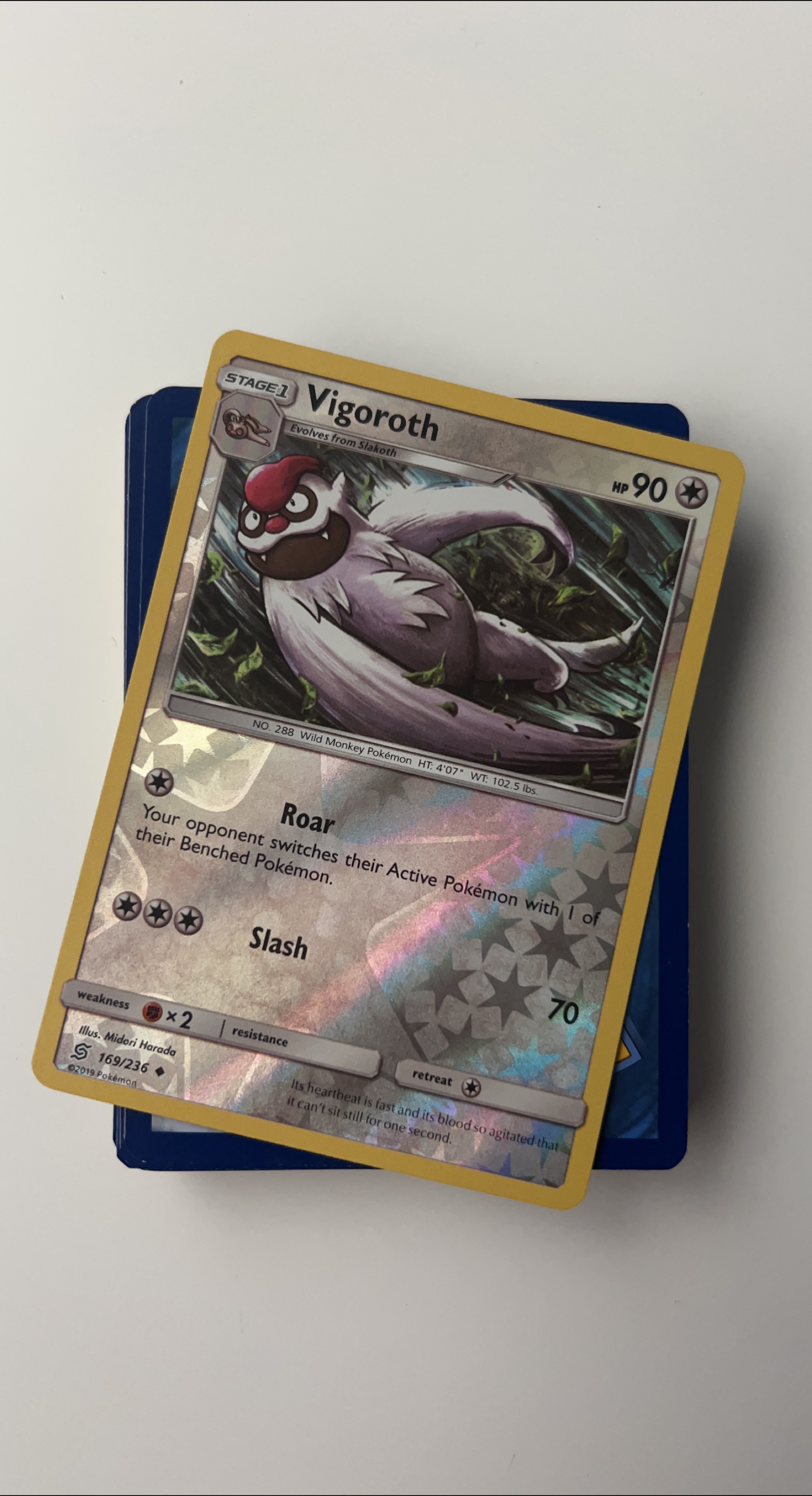 Selling a Vigoroth Pokemon card. It evolves from Slakoth. It is card number 169/236 from the 2019 Pokemon set. Its heartbeat is fast and its blood so agitated that it can't sit still for one second