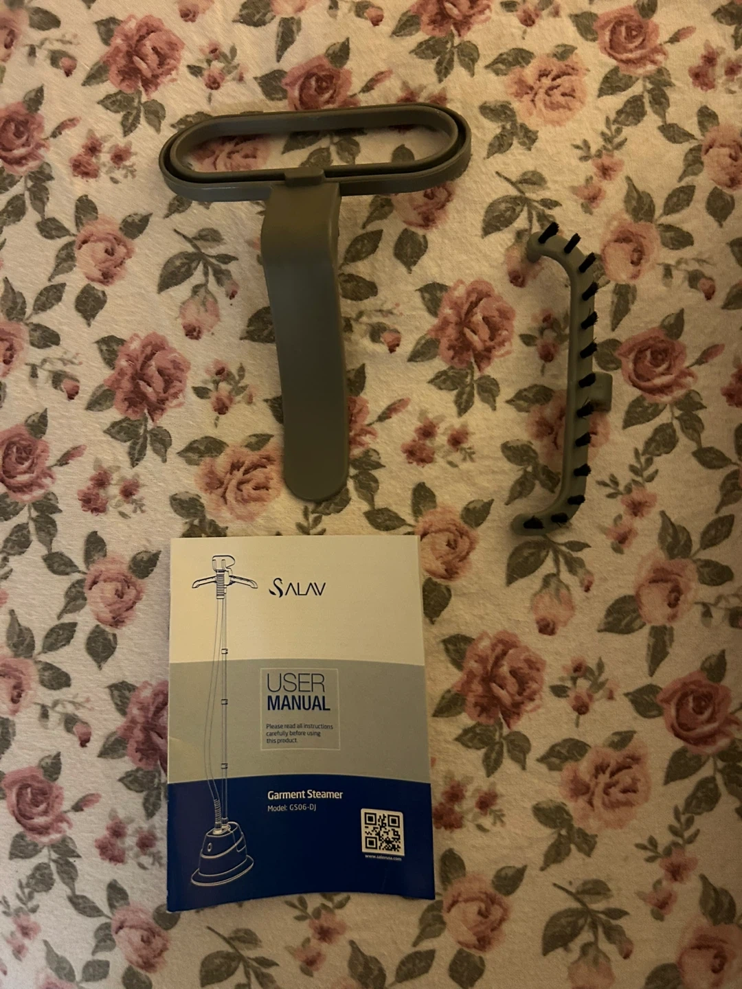 SALAV garment steamer in pink. It comes with a user manual and attachments. Included accessories: Pants Press Attachment, Fabric Brush.