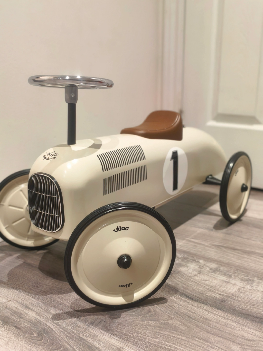 10This is a VILAC ride-on metal car in cream! It's a super cute vintage-style toy car for kids. The car has a number 1 on the side and the VILAC logo on the wheels. Perfect for little ones who love to zoom around!