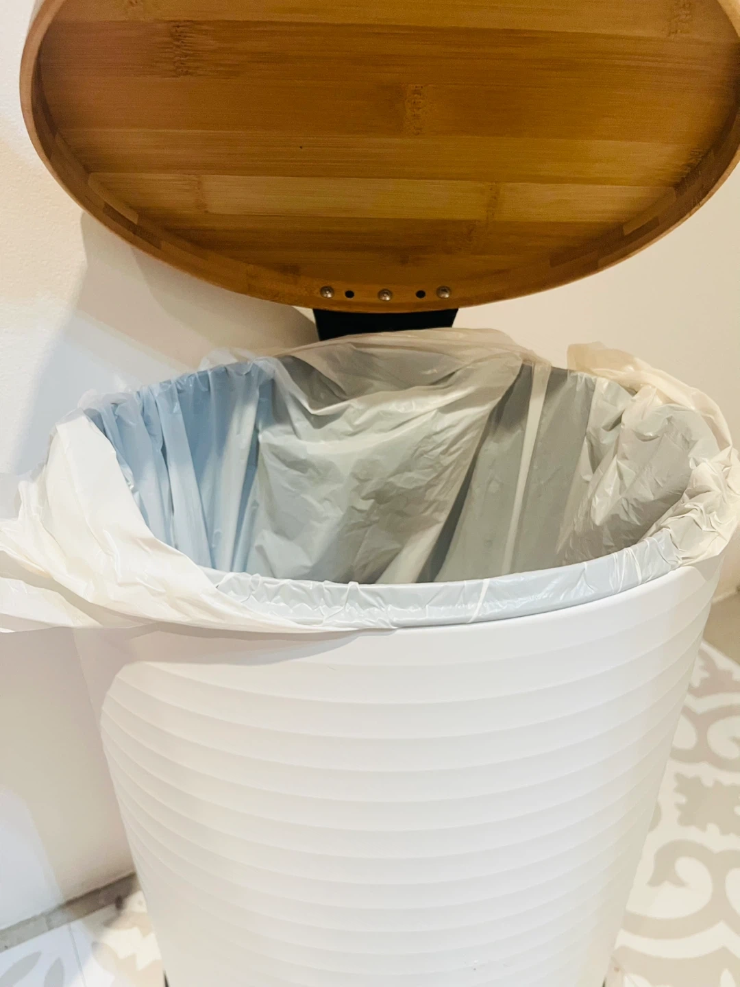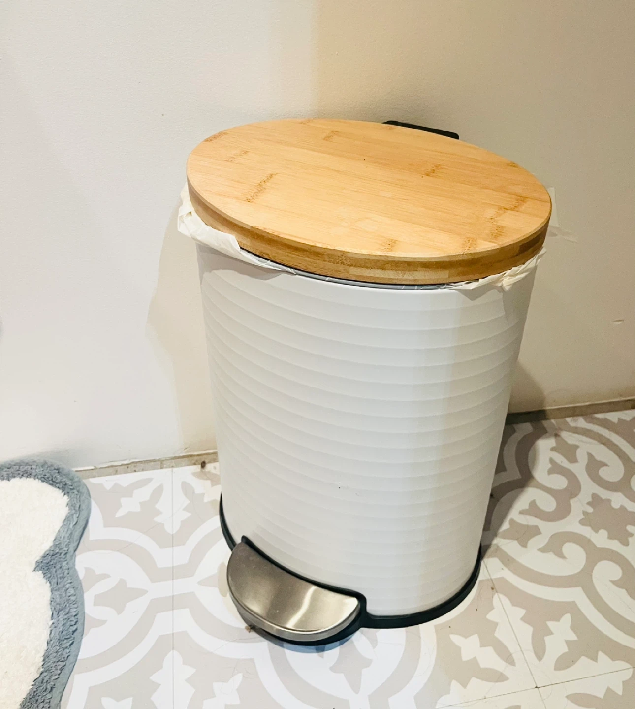White Pedal Trash Can with Bamboo Lid
