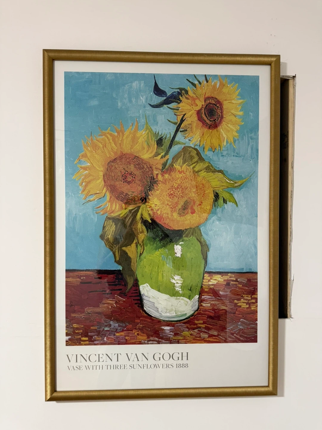 Selling a framed print of Vincent Van Gogh's 'Vase with Three Sunflowers'! It's a beautiful piece that would add a touch of classic art to any room. The frame complements the artwork nicely, making it ready to hang and enjoy