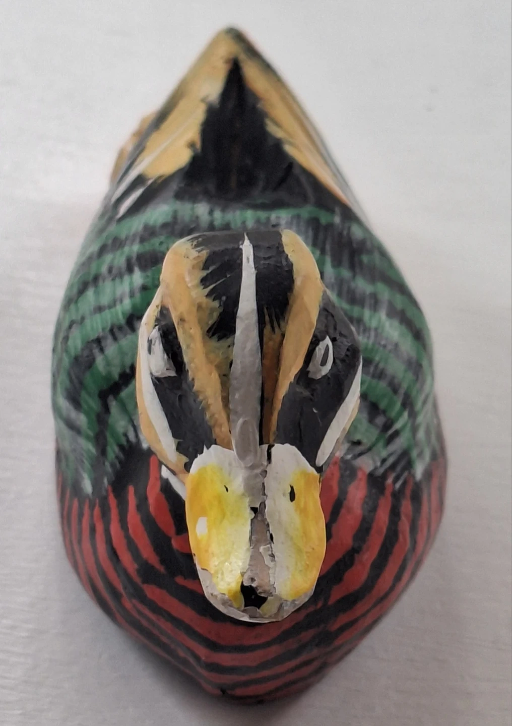 71This is a hand-carved and hand painted bintage wooden duck figurine. It has a unique design with green, red, and yellow paint.