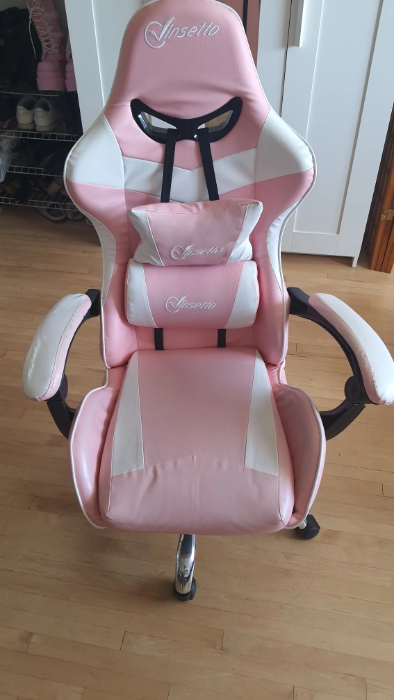 Selling a Vinsetto gaming chair in pink and white. Height and back angle adjustable. Perfect for gaming or working from home. Has some wear and tear, but nothing that affects its functionality. New ones sell around $200. Check out my profile for other furniture! If you've read this and checked my profile, tell me & I'll give you a $5 discount! ๐