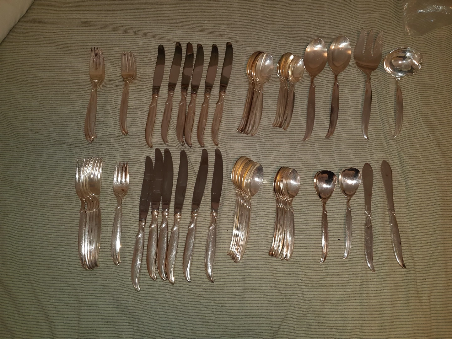 Selling a vintage silverware set by 1847 Rogers Bros in the Flair pattern! This set appears to be in good condition and includes various forks, knives, and spoons. Perfect for adding a touch of elegance to your dining table or completing your collection. complete set of 12. plus a few serving utensils
