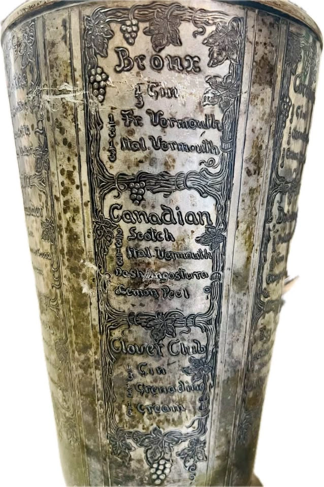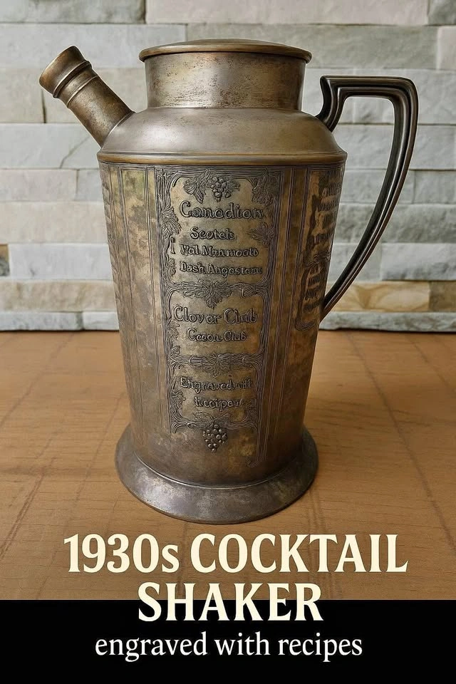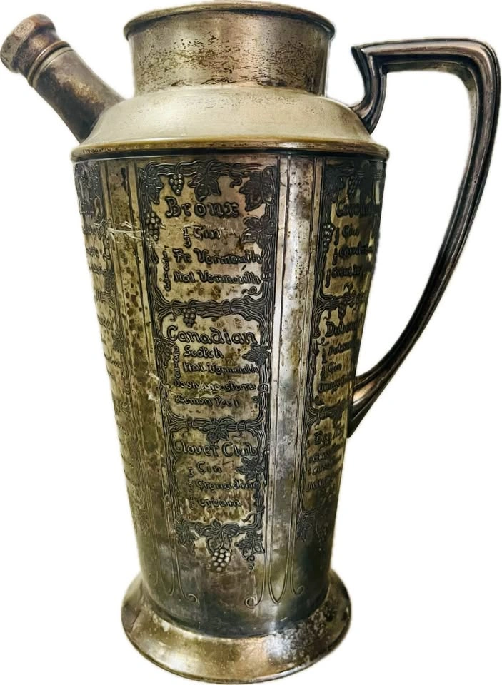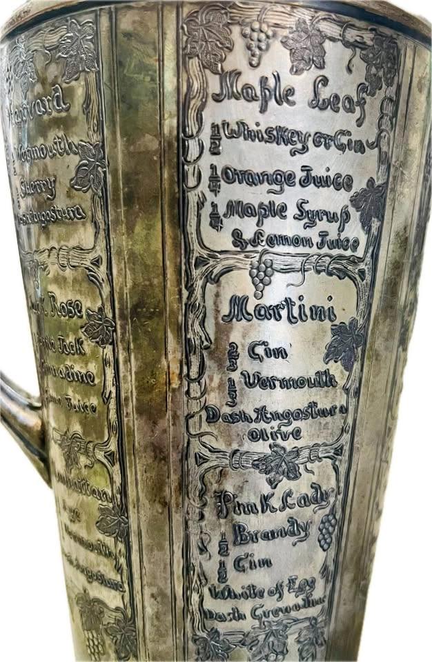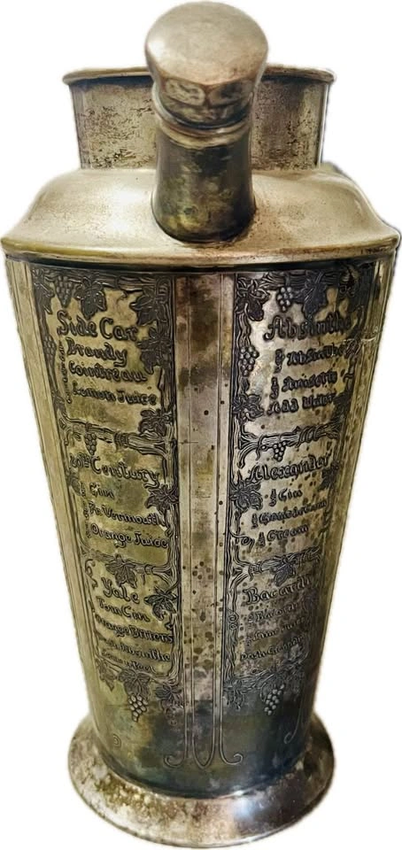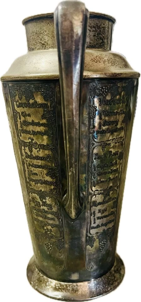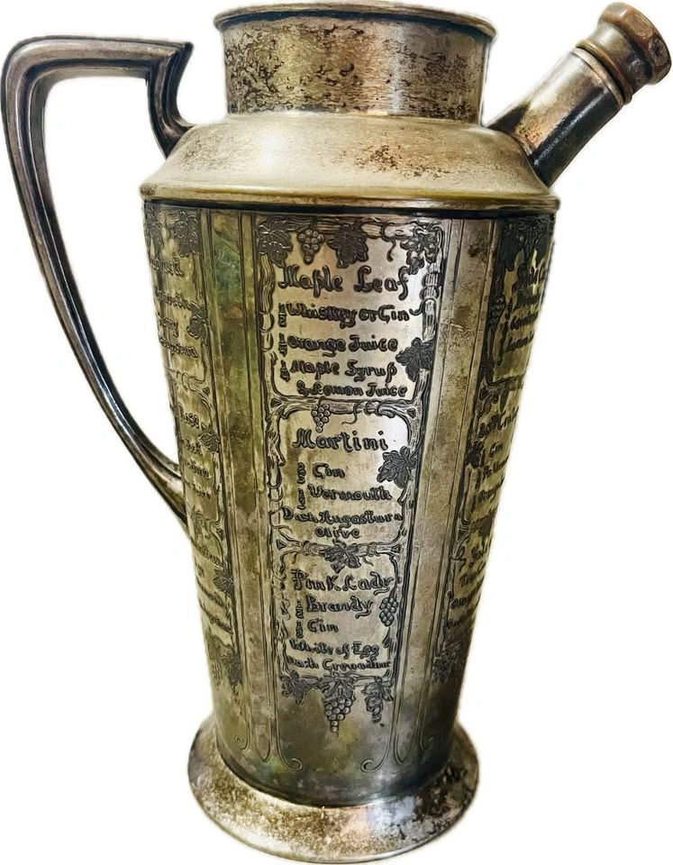 Step back into the glamour of the Art Deco era with this rare 1930s Apollo silver-plated cocktail shaker, produced by Bernard Rice’s Sons, Inc. of New York. This particular model (#5496) is engraved with 18 classic cocktail recipes including the Martini, Side Car, Clover Club, Absinthe, Canadian, and Maple Leaf. The recipes are framed with intricate grapevine and leaf motifs, giving it both utility and decorative appeal. It also carries the charming slogan “What’ll yer have?” on the base – a nod to the social drinking culture of its time. • Maker: Bernard Rice’s Sons, Inc. (Apollo Silver Co., New York) • Era: 1930s (Art Deco period) • Material: Silver-plated • Details: Engraved with 18 cocktail recipes, grapevine motif, slogan at base • Condition: Displays natural patina and tarnish consistent with age. Missing cap, but still highly collectible and perfect as a display or conversation piece. Selling for $100 OBO. Pickup in Oakville, ON.