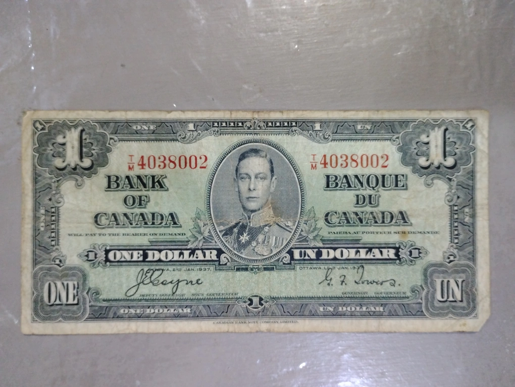 Selling a vintage Bank of Canada one dollar bill from 1937. It's a piece of Canadian history! The bill features King George VI and has a serial number M 4038002. A great item for collectors!