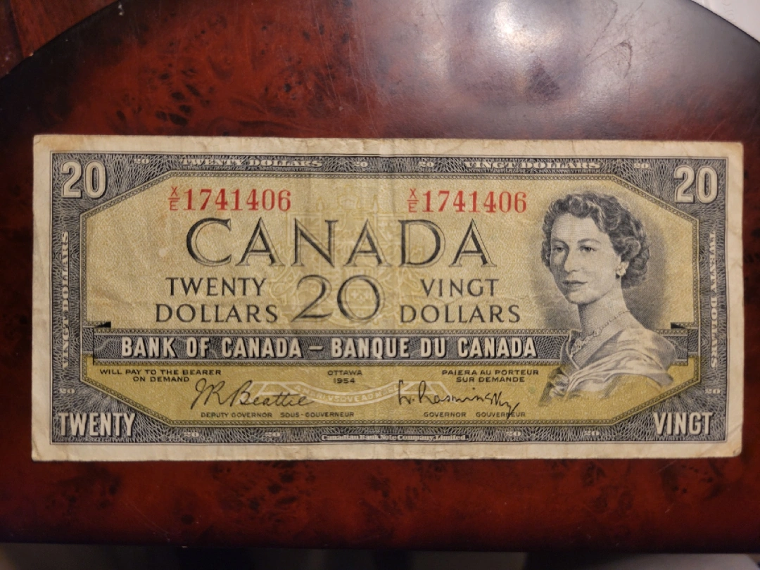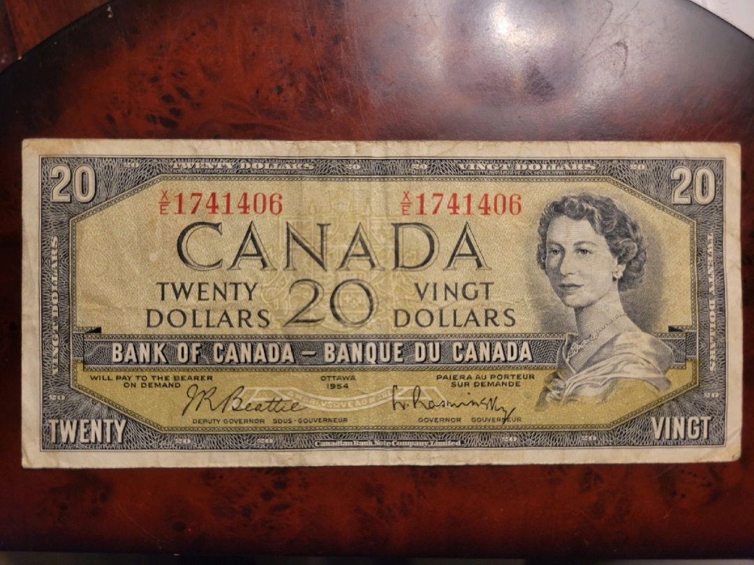 Selling a vintage Bank of Canada twenty dollar bill from 1954. It features a lovely winter scene on one side and Queen Elizabeth II on the other. A great piece of Canadian history!