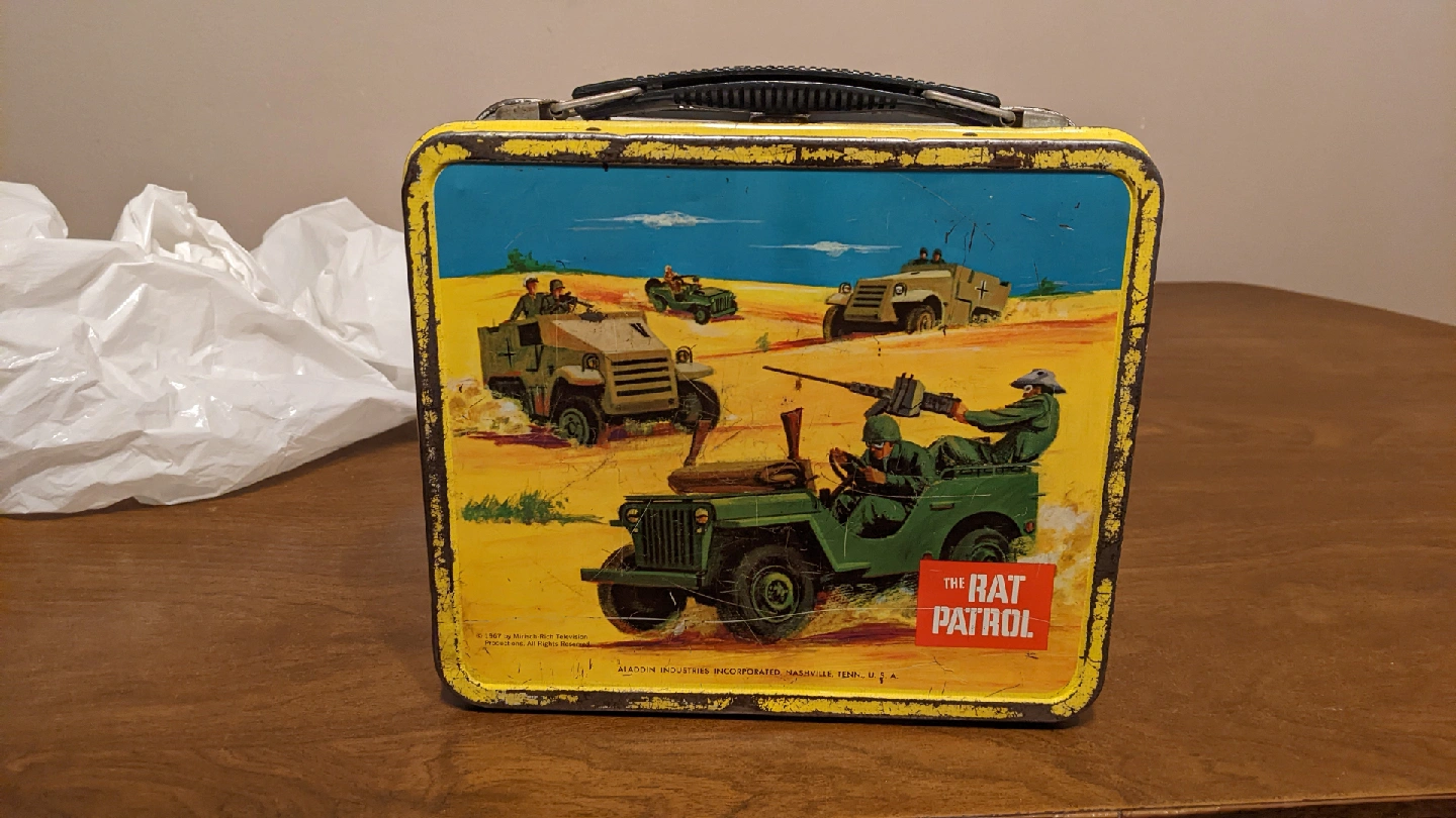 15Selling a vintage 1967 The Rat Patrol lunchbox! It shows some wear and tear from age, but the graphics are still pretty cool. A fun piece of nostalgia for any collector!