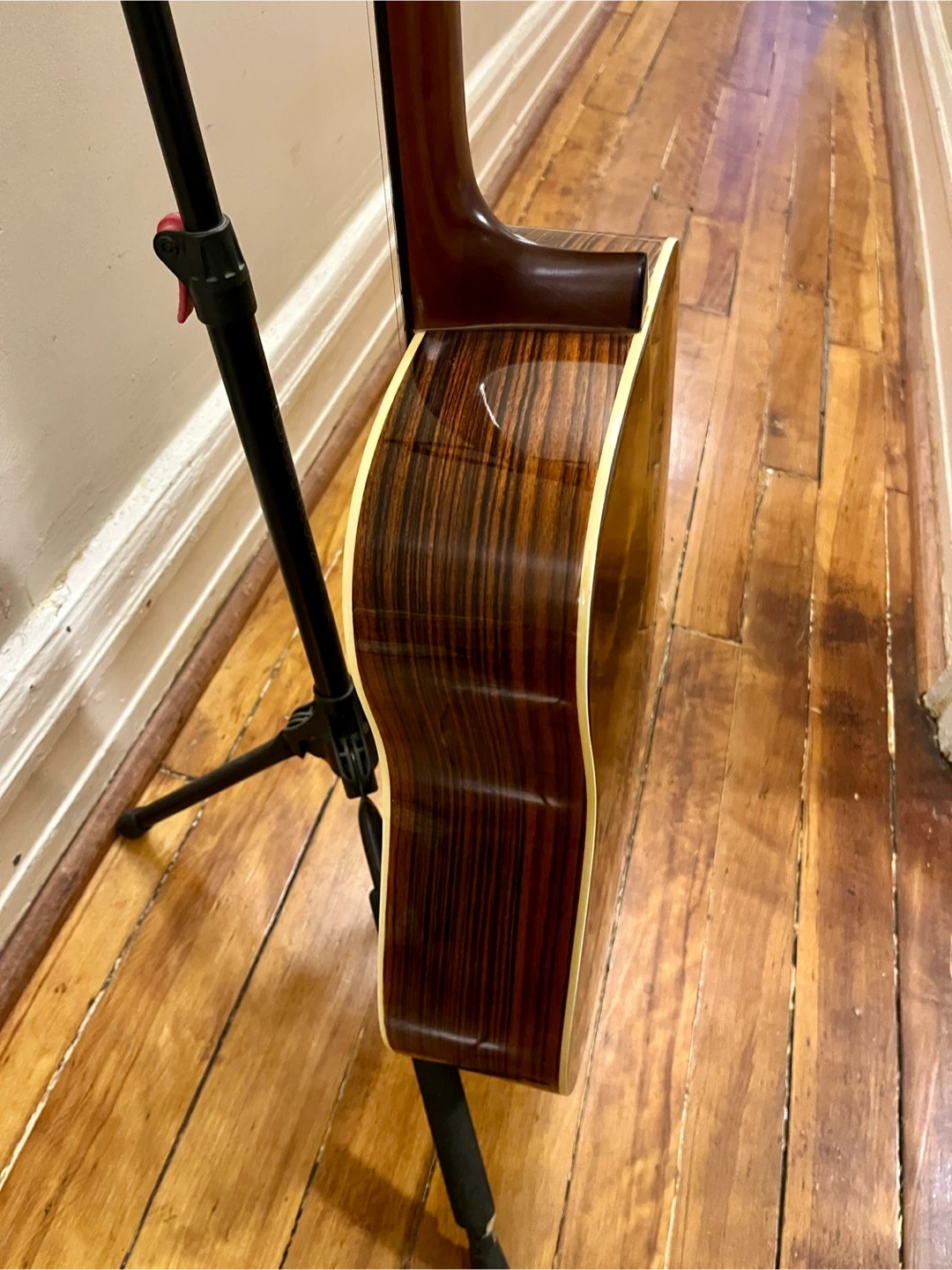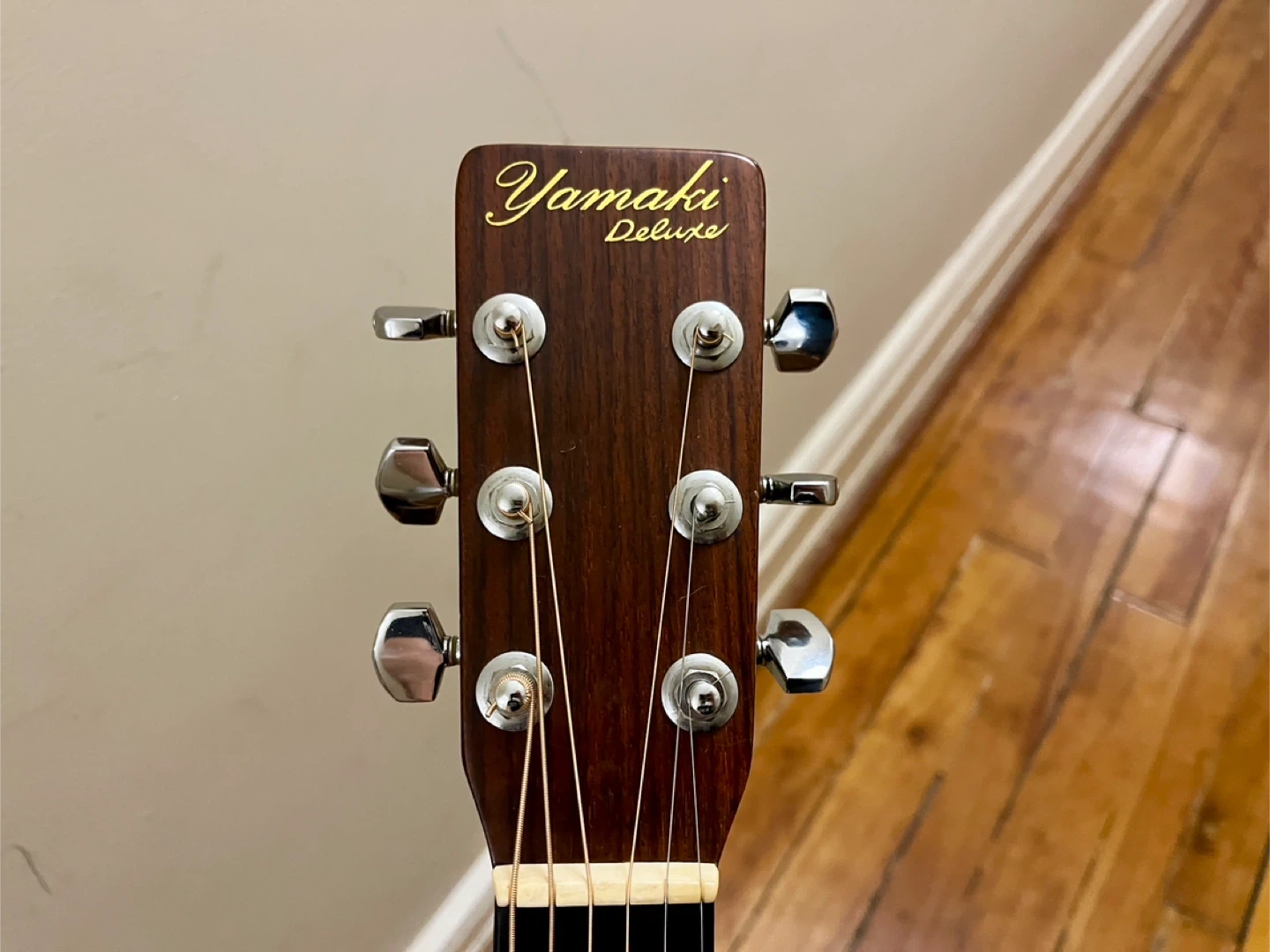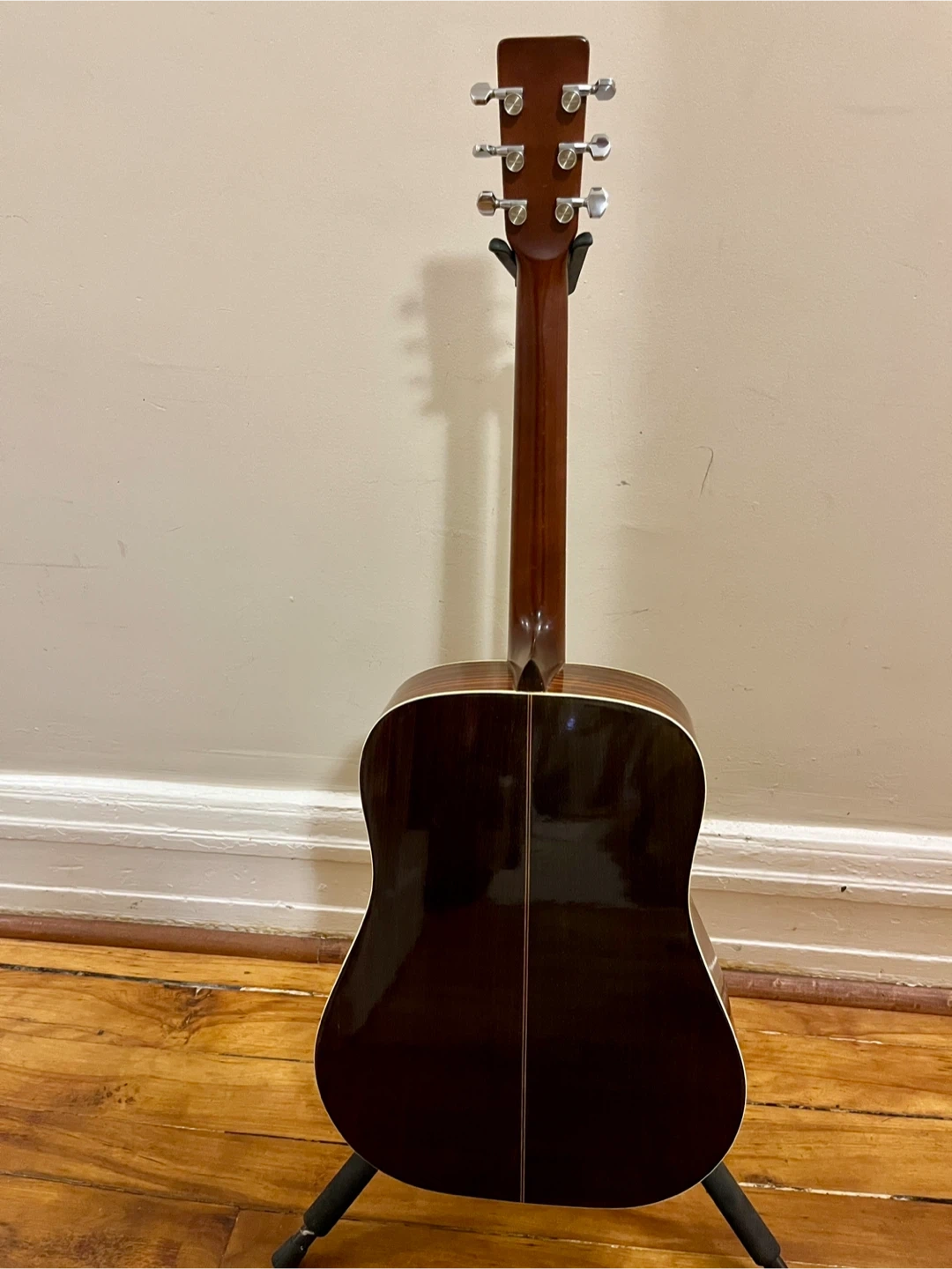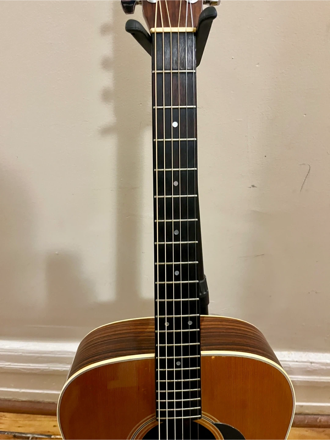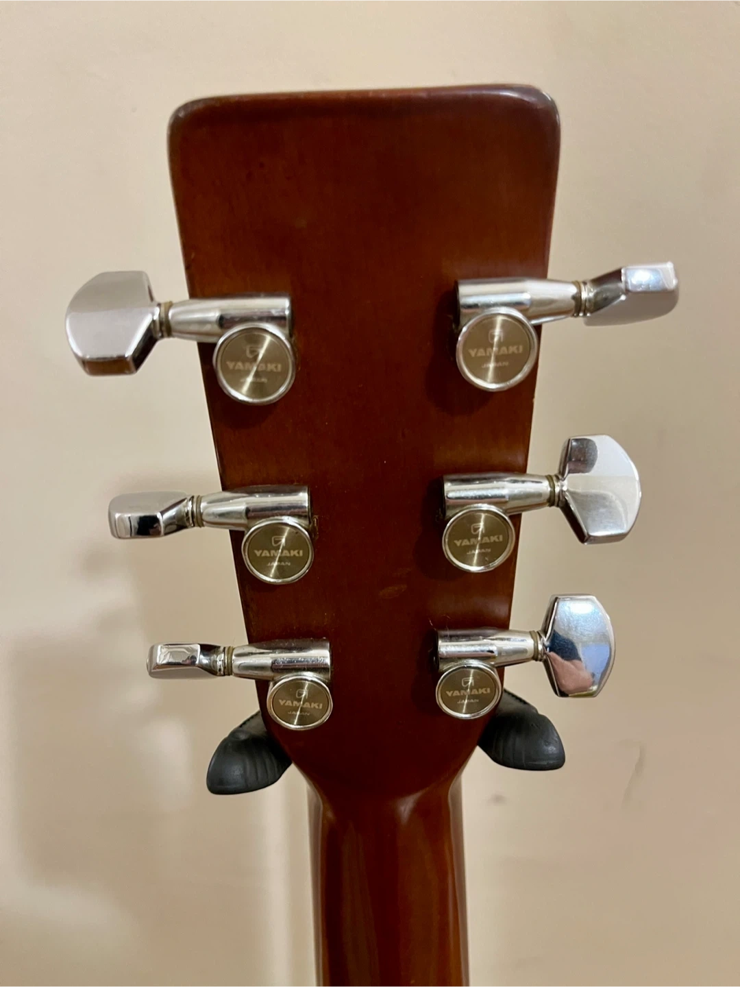 1973 Yamaki AY 335 Dreadnought Acoustic Guitar. Made in Japan. This guitar sounds fantastic, however it is priced low due to needing some work. While it plays nicely in the cowboy chord zone of the first bunch of frets the action gets high as you go up the neck. This guitar has a "belly bulge", the area behind the bridge is raised, I believe this is what is causing the high action, in most cases this can be fixed easily at home by humidifying the inside of the guitar. From research this guitar likely has rosewood back and sides and either a cedar or spruce top. Rosewood fingerboard and very smooth original Yamaki branded tuners. After hearing this guitar you will understand that it is worth putting some time into getting it setup and playing nicely. Comes with a hardshell case that has seen better days but works just fine.