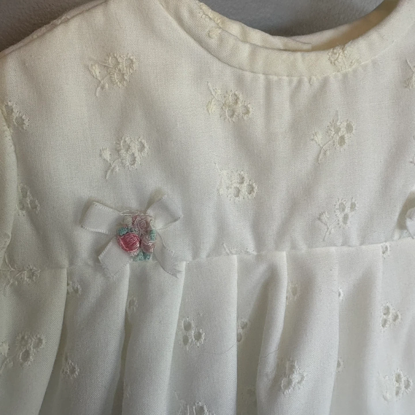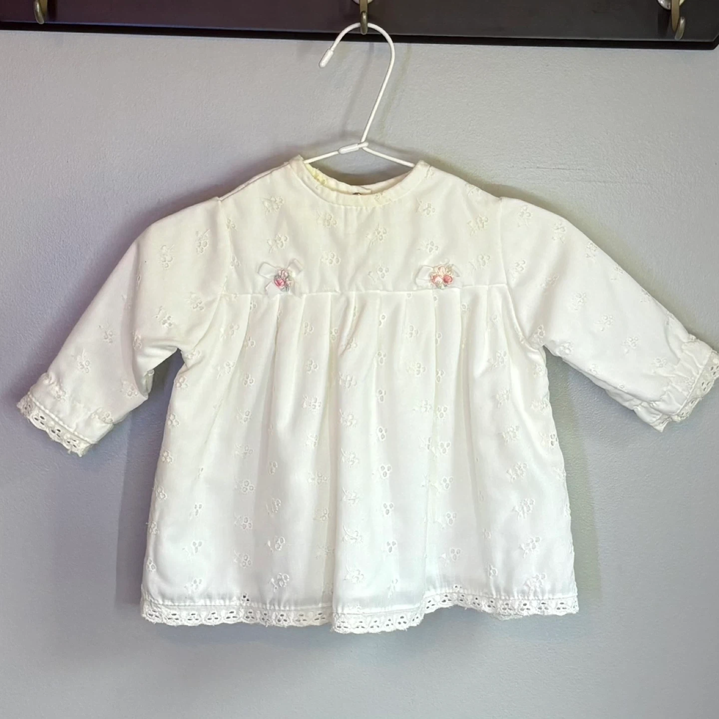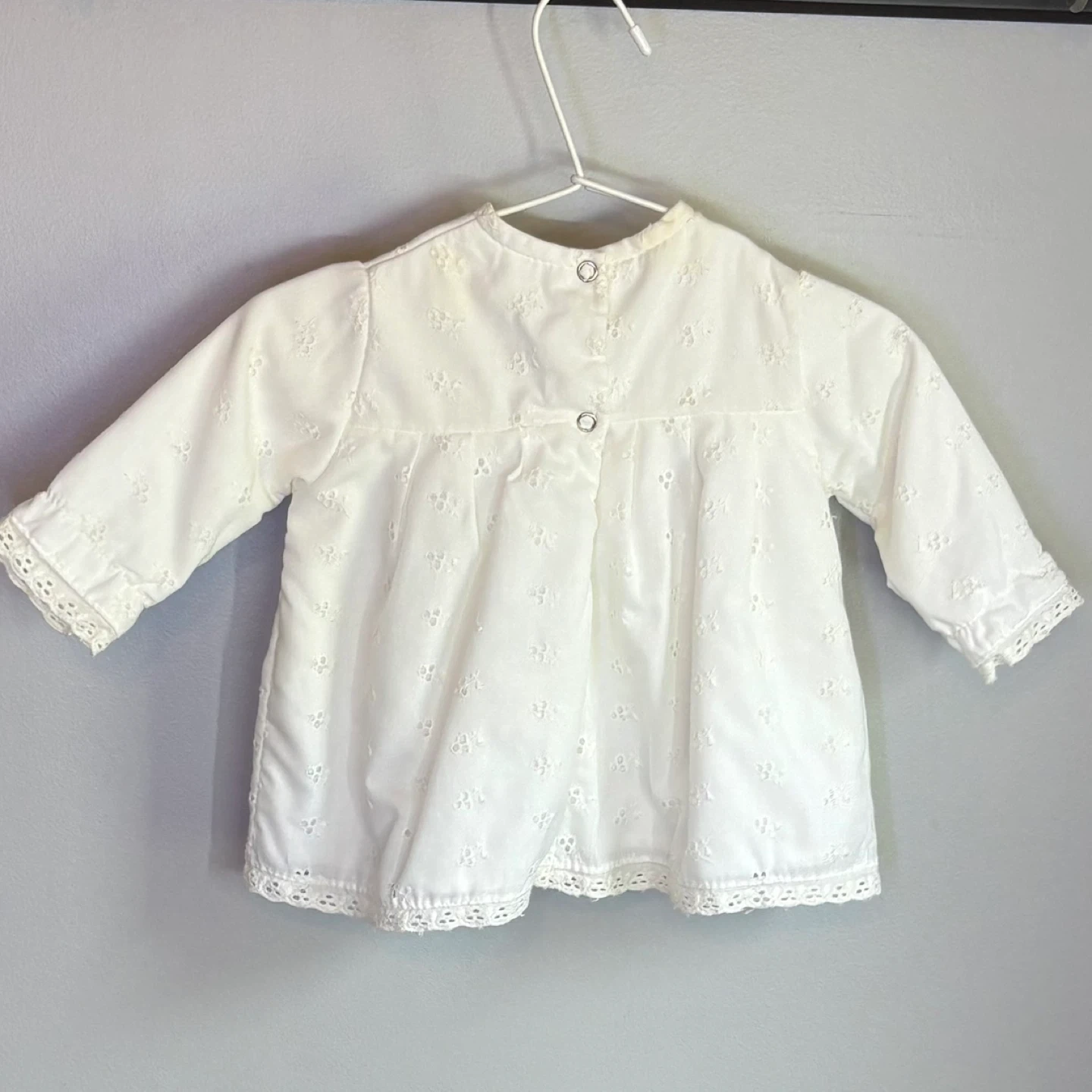 122Adorable vintage baby top from circa 1982 by Baby Care. This long-sleeve pullover features delicate white eyelet lace fabric, sweet floral embroidery on the chest, and lace trim on the cuffs and hem. Snaps at the back of the neck make for easy dressing. A timeless and charming piece for collectors or vintage-inspired baby fashion. Estimated Size: Approx. 12M–18M (12” pit to pit) Material: 100% Cotton eyelet lace Closure: Snaps at back of neck Style: Pullover blouse Brand: Baby Care by Dollycare Era: 1980s, 80s, 1982, ‘82 Color: White Print: Eyelet floral pattern Material: Cotton/Polyester blend Condition: Vintage, excellent pre-owned condition Size: Estimated 12M–18M (12” pit to pit) See photos for measurements. Flaws: None noted. Cross posted. keywords: vintage baby top, 1980s baby blouse, Baby Care vintage clothing, eyelet lace baby shirt, white infant blouse, toddler lace top, heirloom baby clothes, retro baby outfit, vintage baby girl clothing, classic baby fashion Winnipeg - Pick up only (Located 2 blocks west of Polo Park). Shipping options available through other platforms message me for details.
