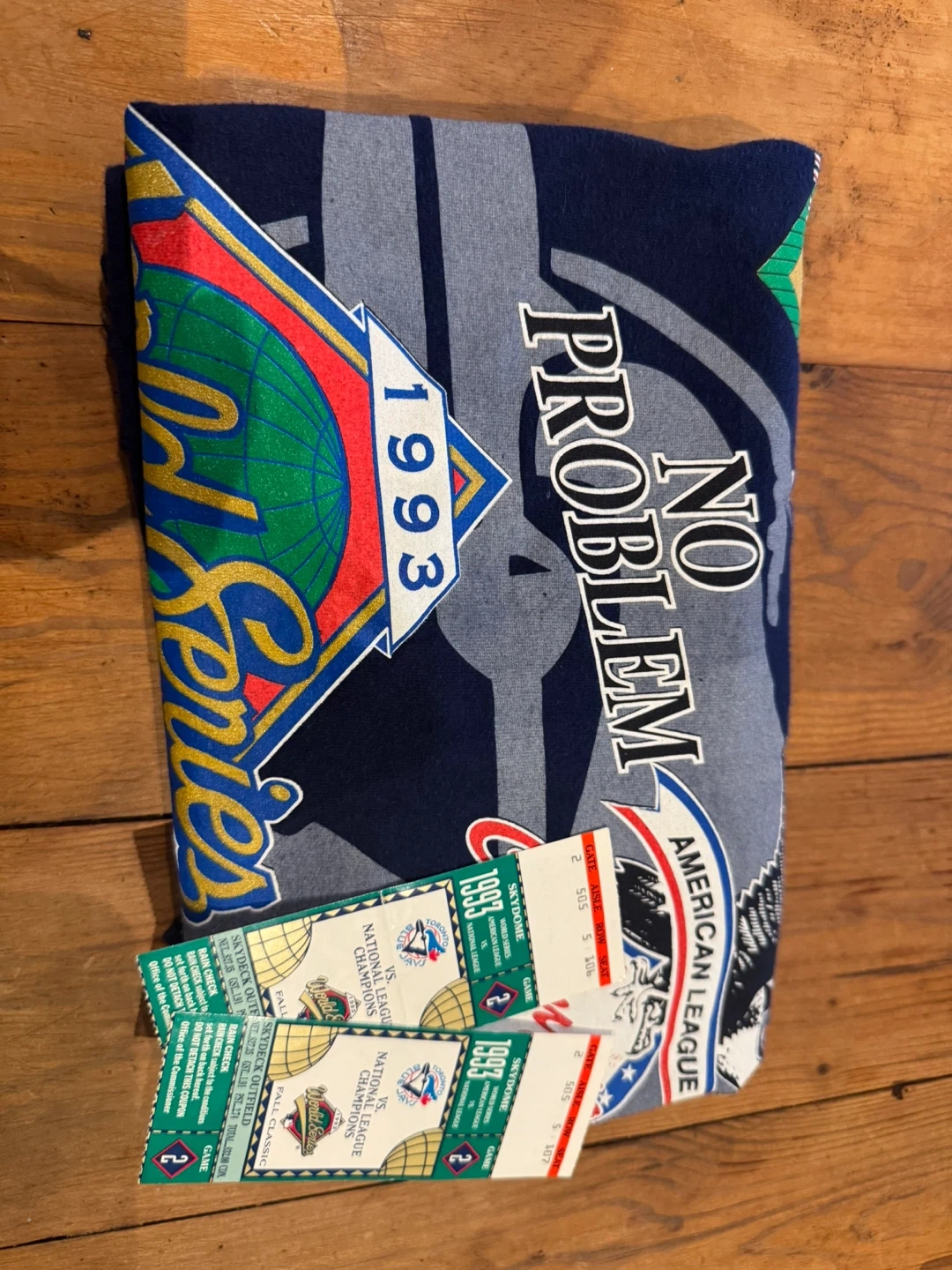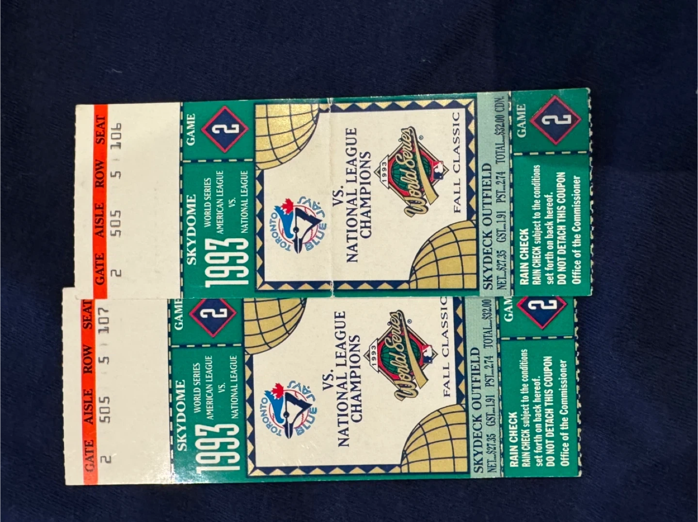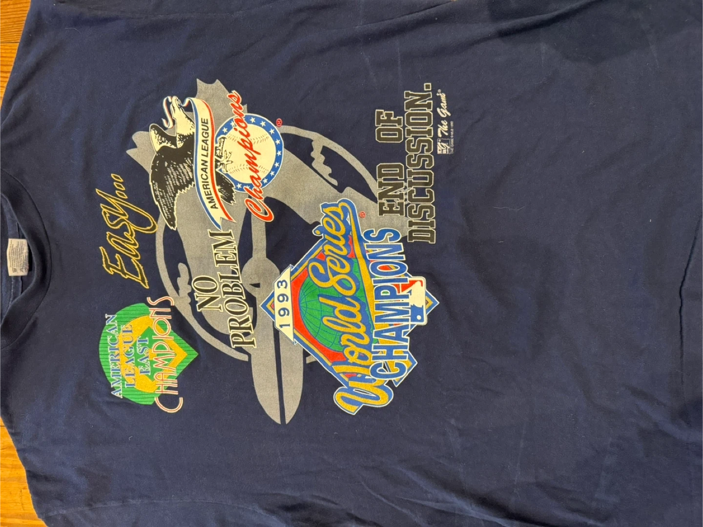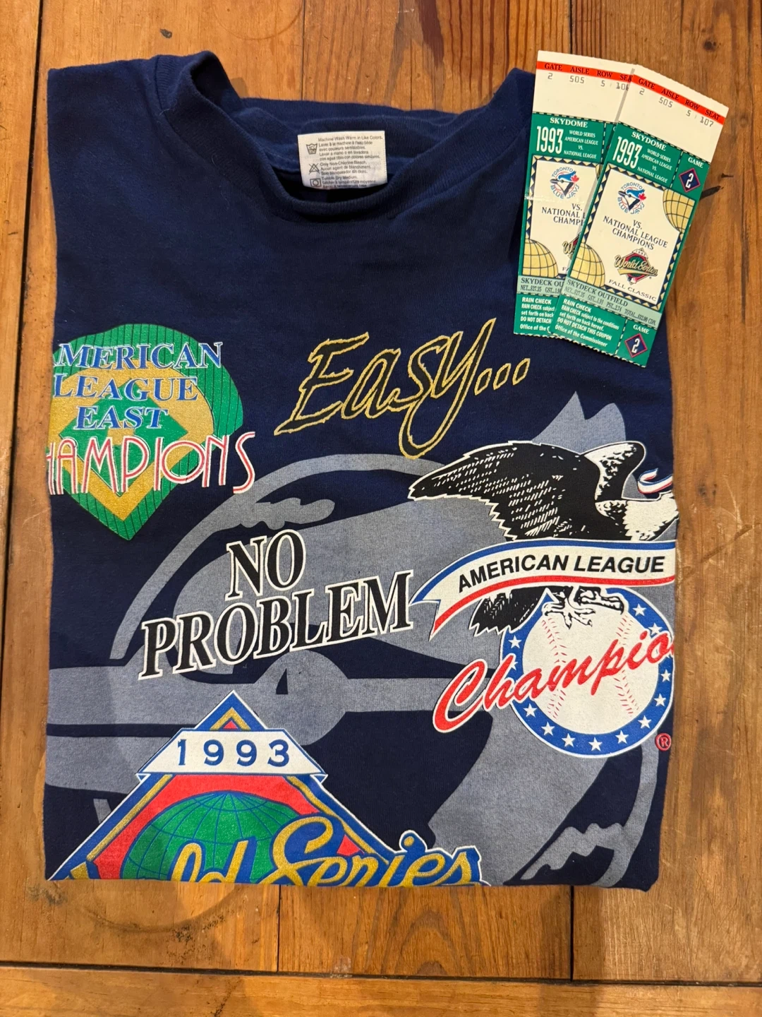 31Selling a vintage 1993 Toronto Blue Jays World Series T-shirt with matching tickets! The shirt is navy blue and features logos from the American League and World Series. Great for any Jays fan or collector!