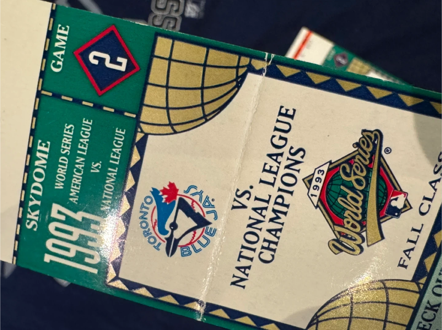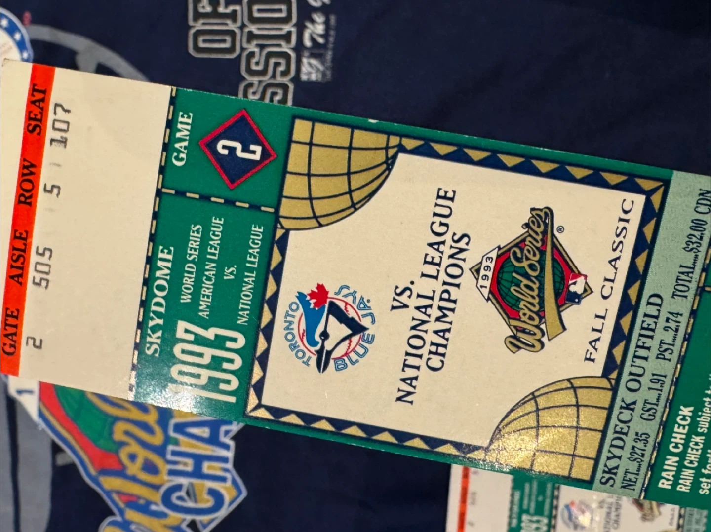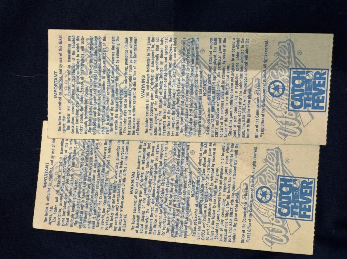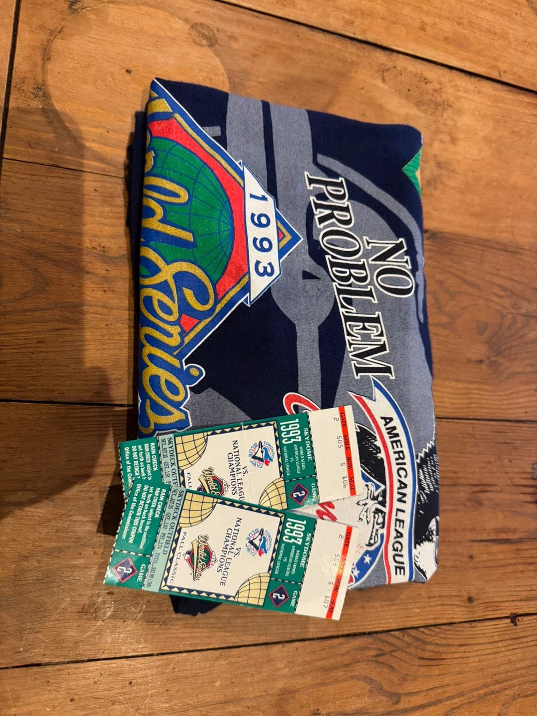 31Selling a vintage 1993 Toronto Blue Jays World Series T-shirt with matching tickets! The shirt is navy blue and features logos from the American League and World Series. Great for any Jays fan or collector!