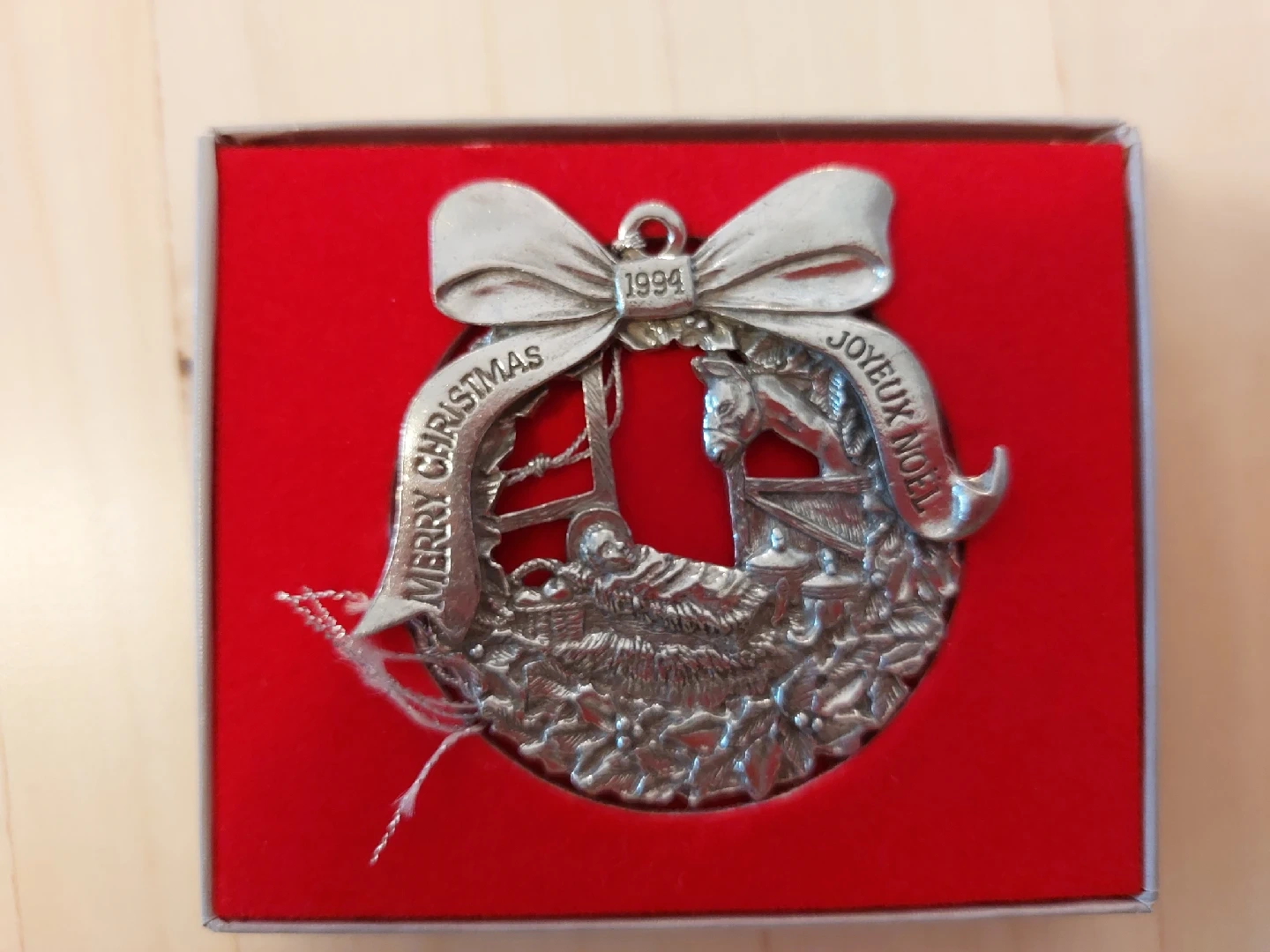 15Selling a vintage Christmas pewter ornament dated 1994! It's anl ornament featuring a nativity scene within a wreath. The box is included, adding to its vintage charm. About 2.5 inches in diameter. P/U near Blundell and Gilbert roads in Richmond. Door pickup only. Prefer cash please.