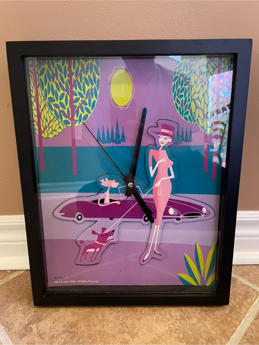 76Add a touch of retro charm to your space with this Pink Panther framed wall clock! It features a fun, colourful design with the Pink Panther and a lady in a pink dress. It's in great condition and ready to hang. (Collectible Art, going for over $200 on eBay)