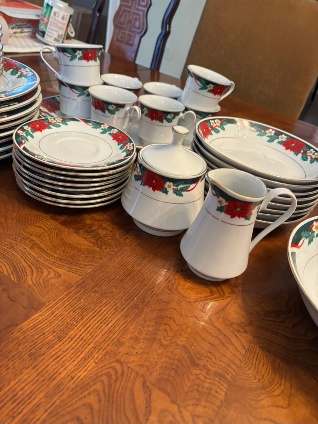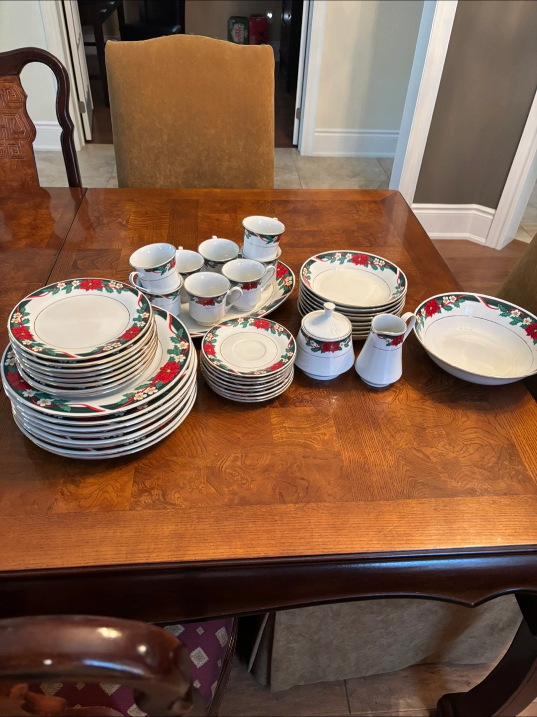Selling a beautiful 45-piece Holiday Poinsettia Dinnerware set. includes dinner plates, side plates, bowls, cups, saucers, a sugar bowl, and a creamer. Perfect for adding a touch of elegance to your holiday table!