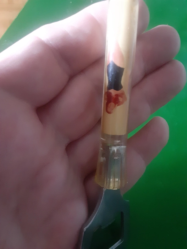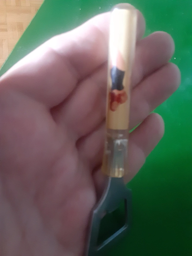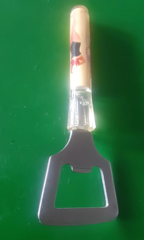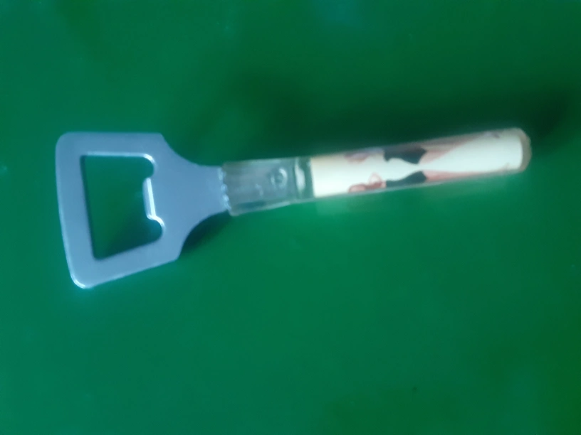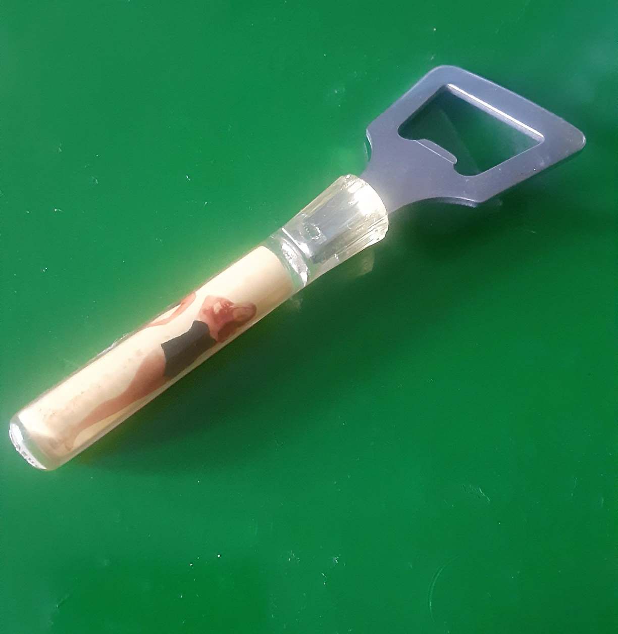 Here's a bottle opener with a fun pin-up design on the handle! It's in good shape and ready to pop open your favourite drinks