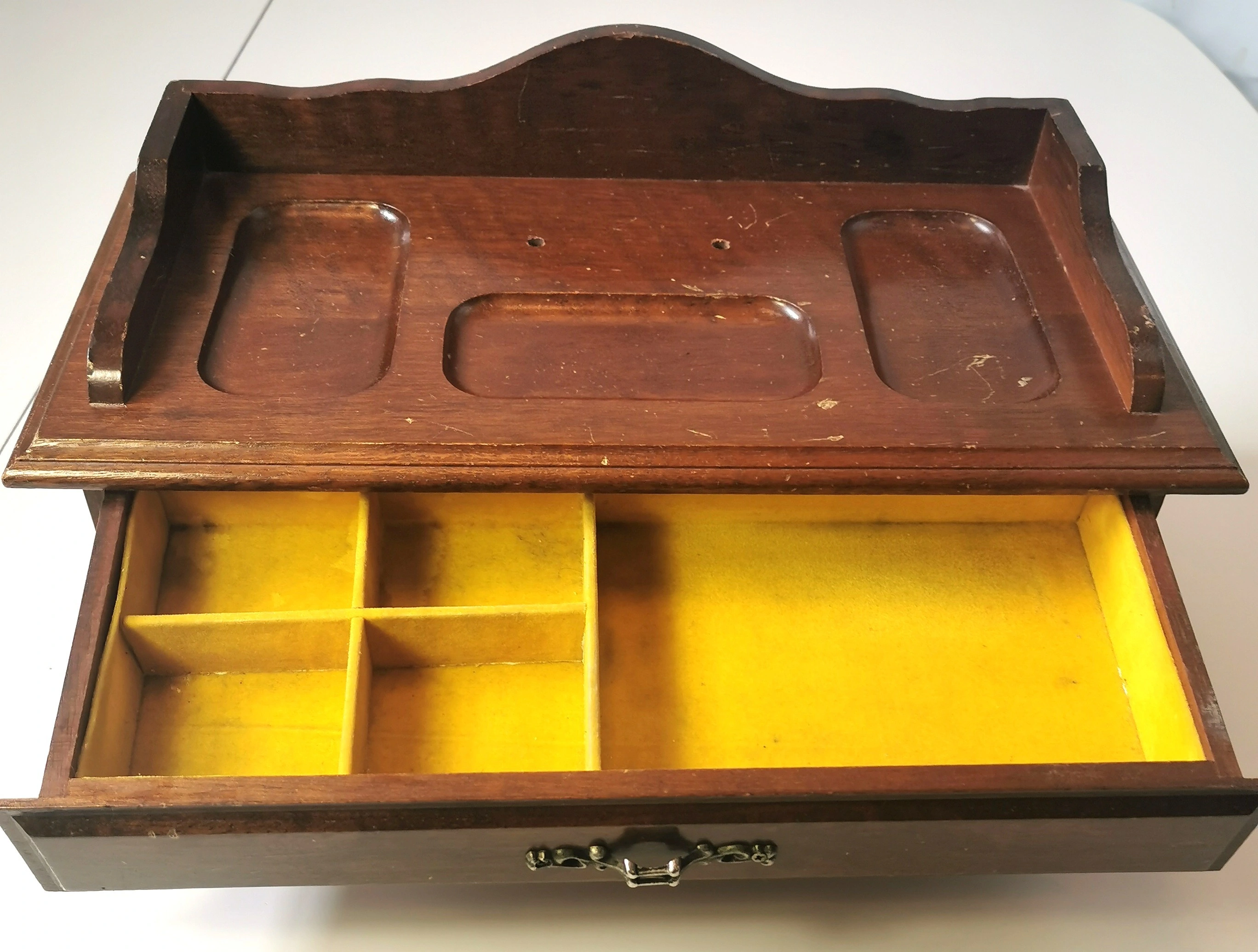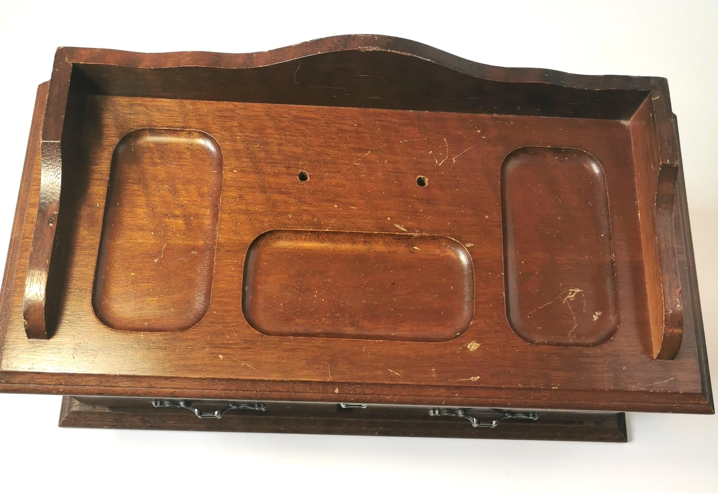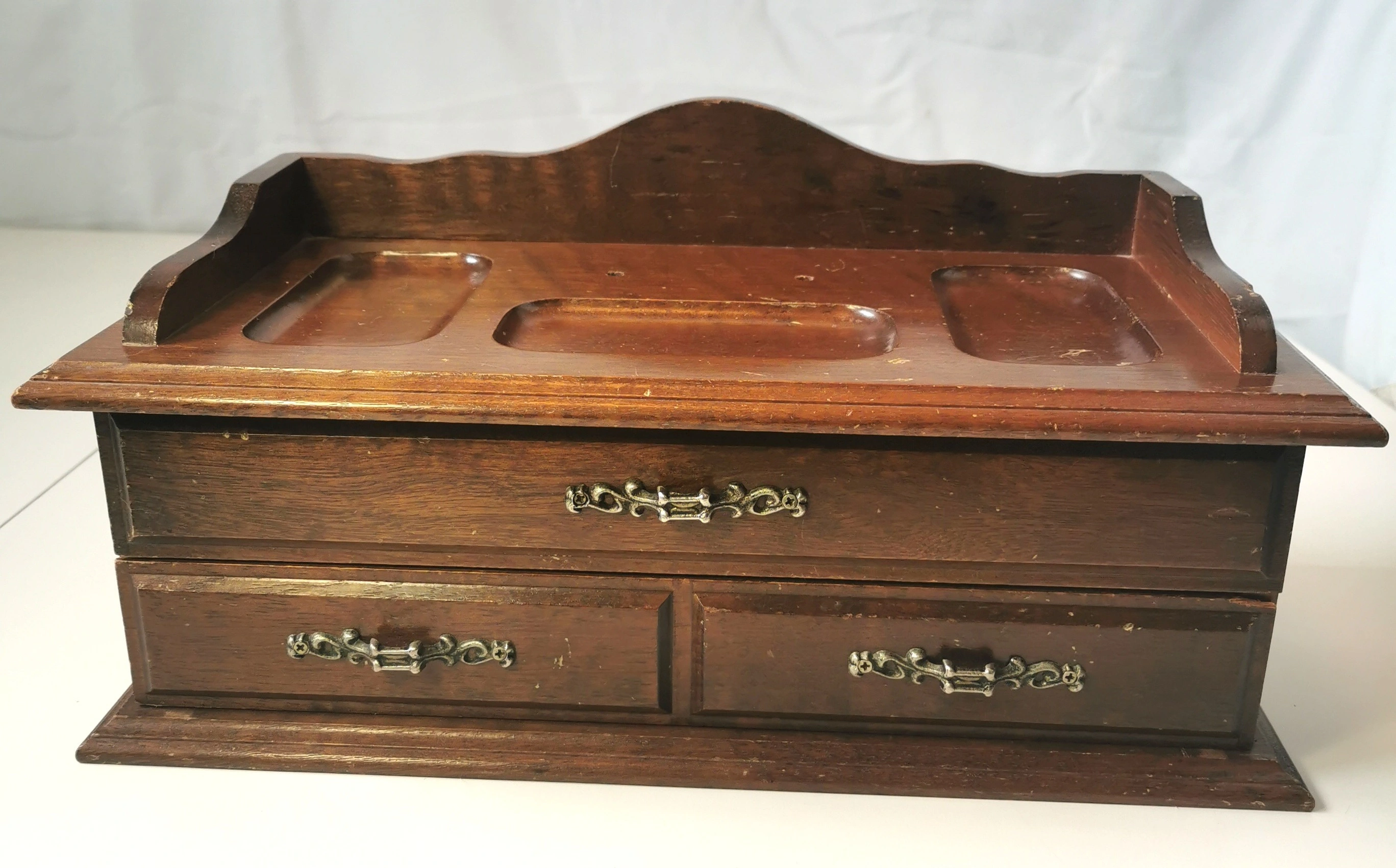 Step back in time with this handsome and classic men's valet box from the 1970s. Made by Dynasty in Taiwan, this piece is the perfect organizer for a dresser, nightstand, or entryway table, adding a touch of vintage charm to any space. Crafted from a dark-stained wood, this organizer features a thoughtfully designed two-tier layout. The top level is an open caddy or "catchall" with multiple recessed compartments, ideal for holding daily essentials like a watch, keys, coins, rings, and cufflinks. The lower section provides concealed storage with three drawers: one long drawer across the top and two smaller drawers below, all featuring their original ornate, antique-style metal pulls. A perfect and stylish gift for any gentleman who appreciates classic design and quality craftsmanship. Condition: This is a genuine vintage item with a well-loved history. It is in good, solid vintage condition with some signs of wear consistent with its age and use. Please note the scuffs, scratches, and finish wear, particularly on the top tray surface, as shown in the photos and some wear inside the drawers. The drawers slide smoothly and the structure is sturdy. Please review all pictures carefully as they are part of the description. Details & Dimensions: Brand: Dynasty Origin: Made in Taiwan Era: Circa 1970s Materials: Wood, Metal Hardware Dimensions: Length: 13.75 inches Width/Depth: 6.75 inches Height: 6.75 inches