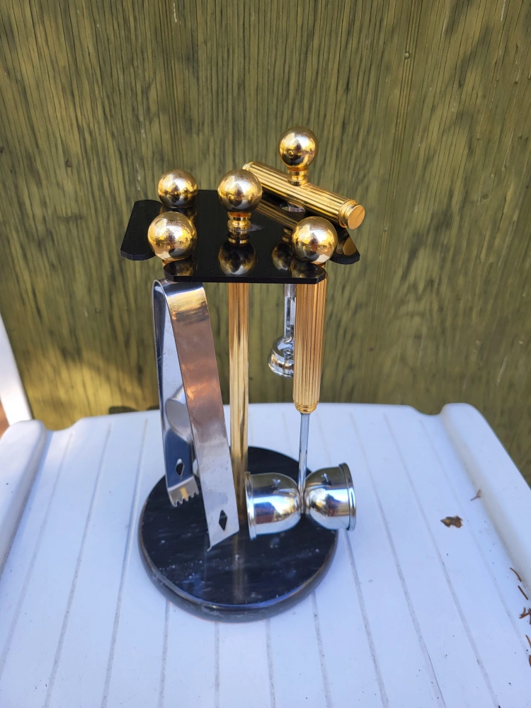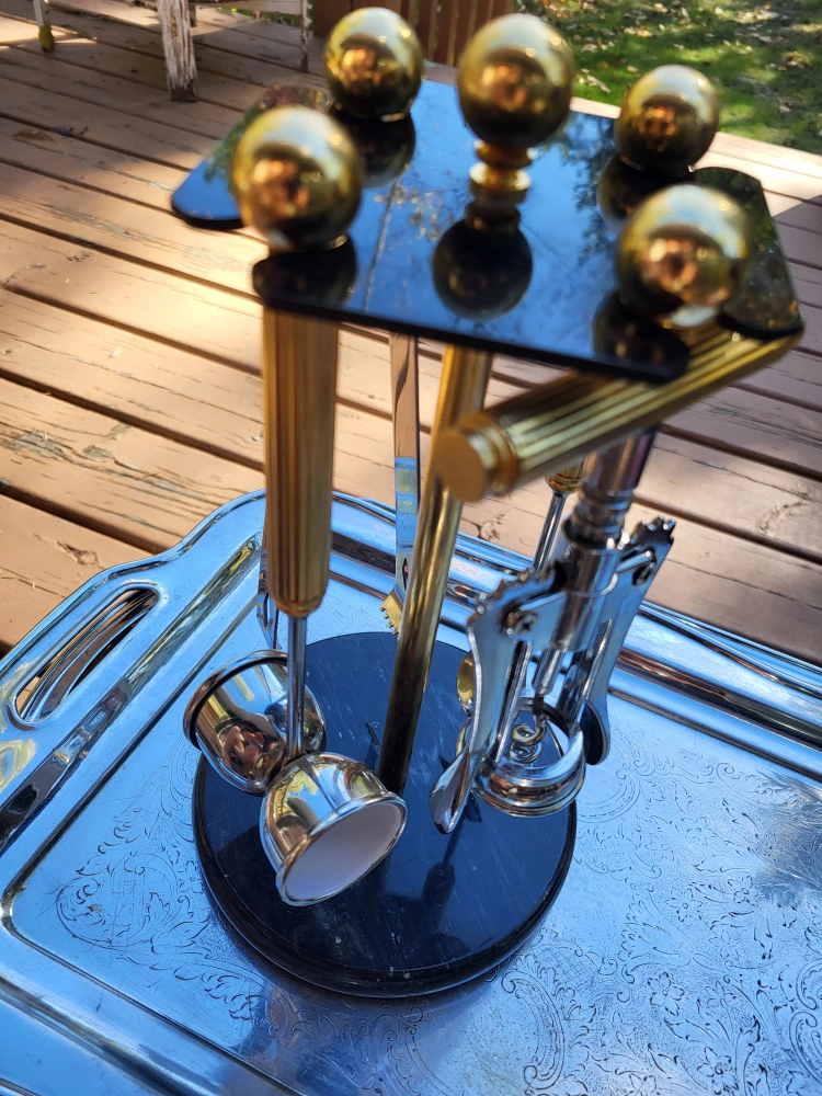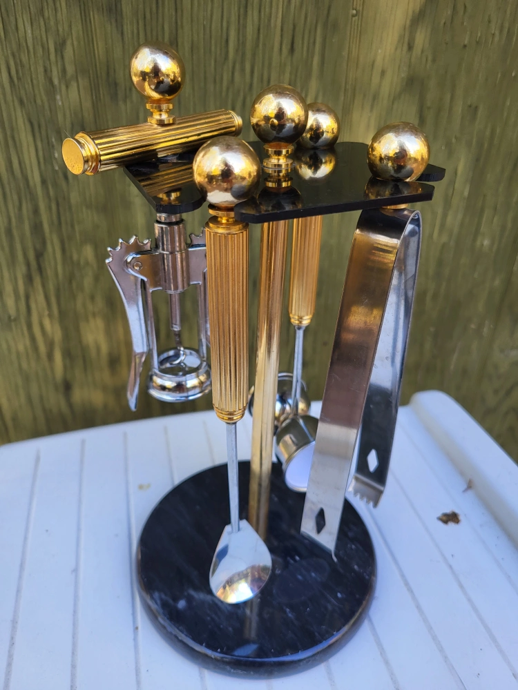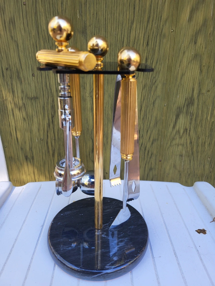 Well made Hollywood Regency brass and stainless steel five piece cocktail bar tool set by Maxwell Phillips, circa 1970s. The set includes four bar tools (wine opener, long stir spoon, jigger and ice tongs) made of chrome plated steel with brass handles. The base is solid marble and holds the tools very securely. Excellent Condition - barely used 70's vintage.