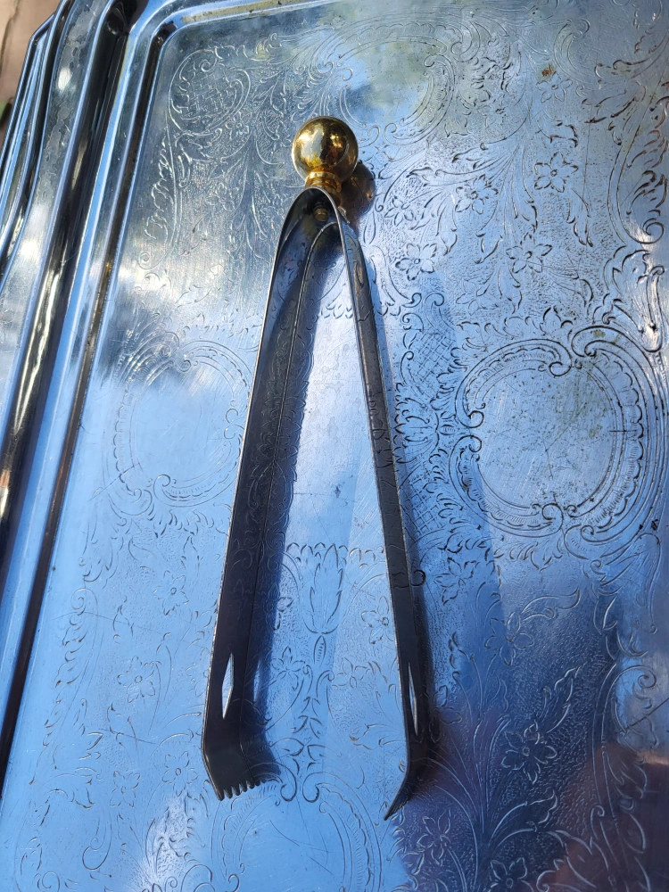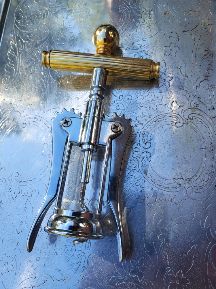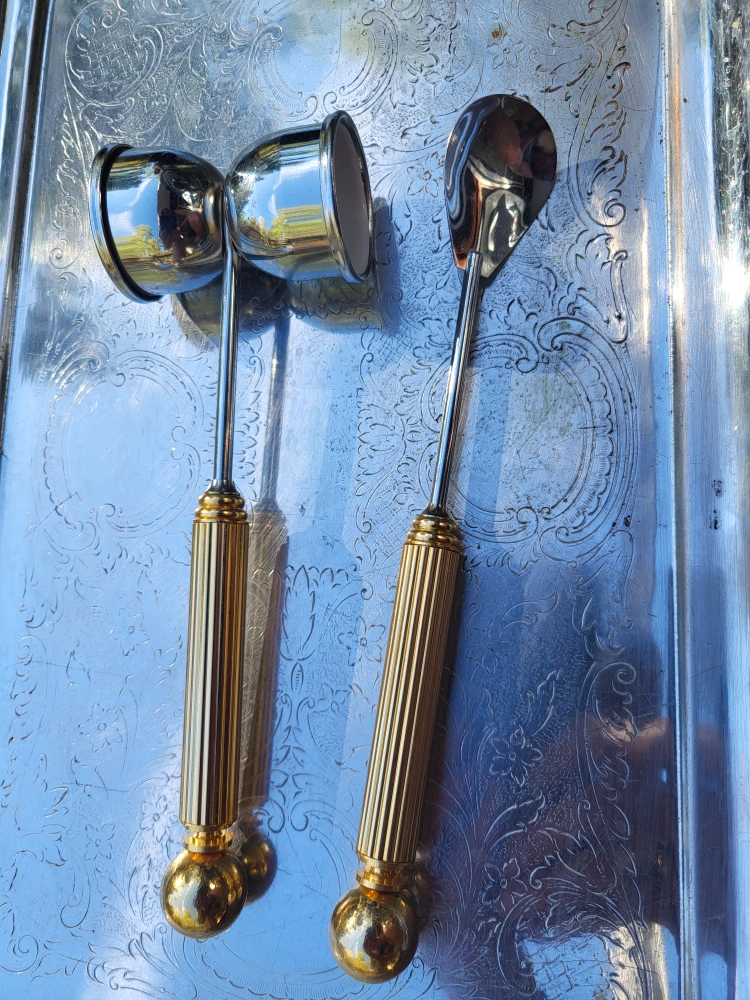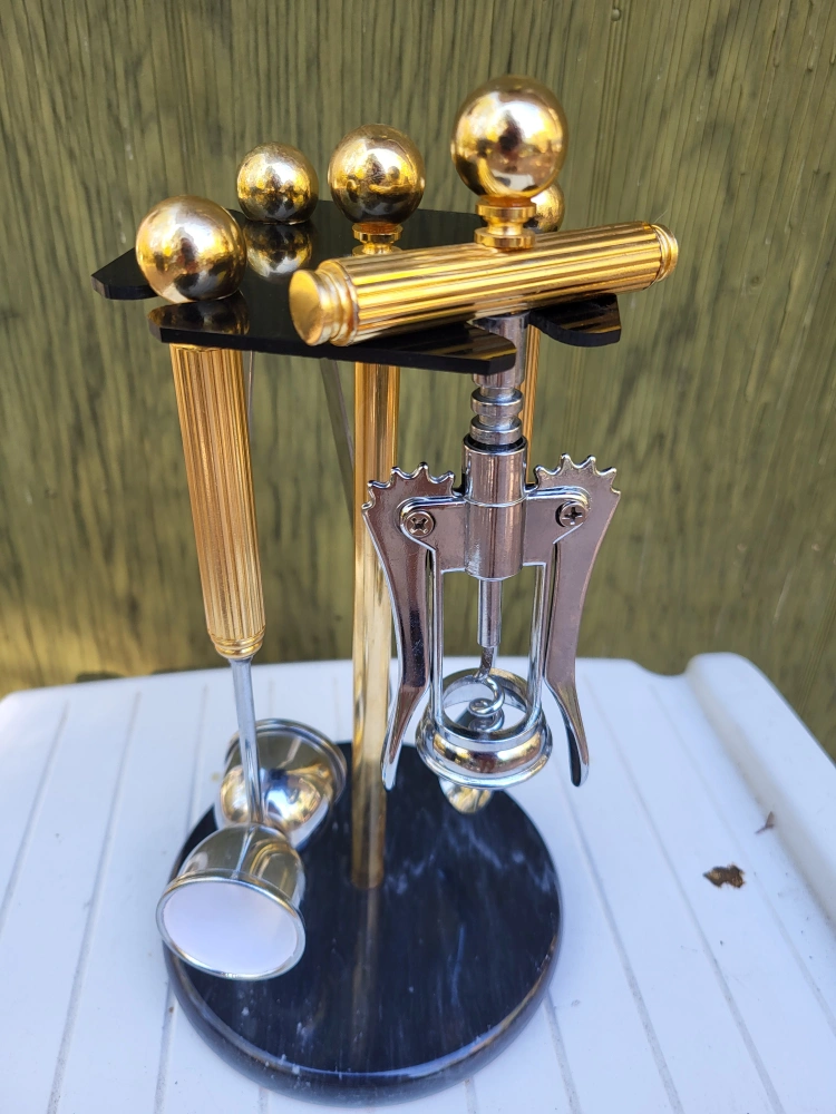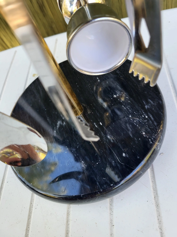 Well made Hollywood Regency brass and stainless steel five piece cocktail bar tool set by Maxwell Phillips, circa 1970s. The set includes four bar tools (wine opener, long stir spoon, jigger and ice tongs) made of chrome plated steel with brass handles. The base is solid marble and holds the tools very securely. Excellent Condition - barely used 70's vintage.