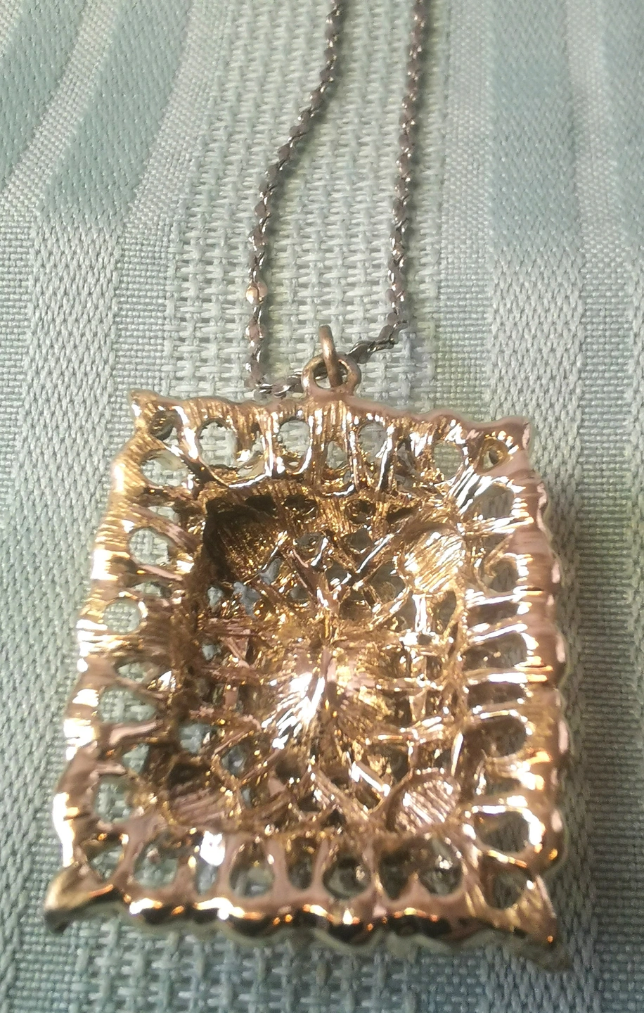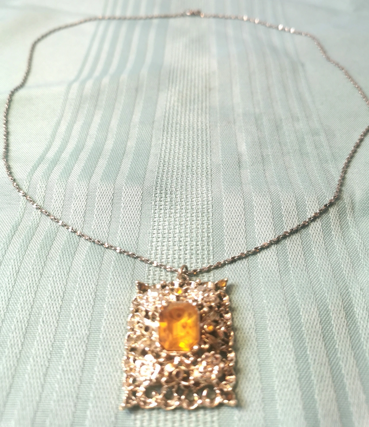60Add a bold pop of vintage glam to your outfit with this striking 1980s silver-tone necklace, featuring a radiant citrine-colored glass centerpiece in an ornate rectangular filigree setting. Sparkling accent stones surround the main gem, creating an eye-catching retro statement look. This vintage costume piece is perfect for collectors or creative crafters. Some small accent stones are missing (see photos), but the piece remains structurally sound and wearable as-is. Details: Era: 1980s Style: Vintage costume jewelry / Retro glam Pendant: Ornate filigree rectangle with citrine glass stone (faceted) Accent Stones: Clear rhinestones (some missing) Metal Tone: Silver-tone (not sterling) Chain Length: Approx. 13.25 inches Clasp: Spring ring Condition: Good vintage condition; missing a few gemstones (priced accordingly) Perfect For: Vintage jewelry lovers, retro fashion fans.