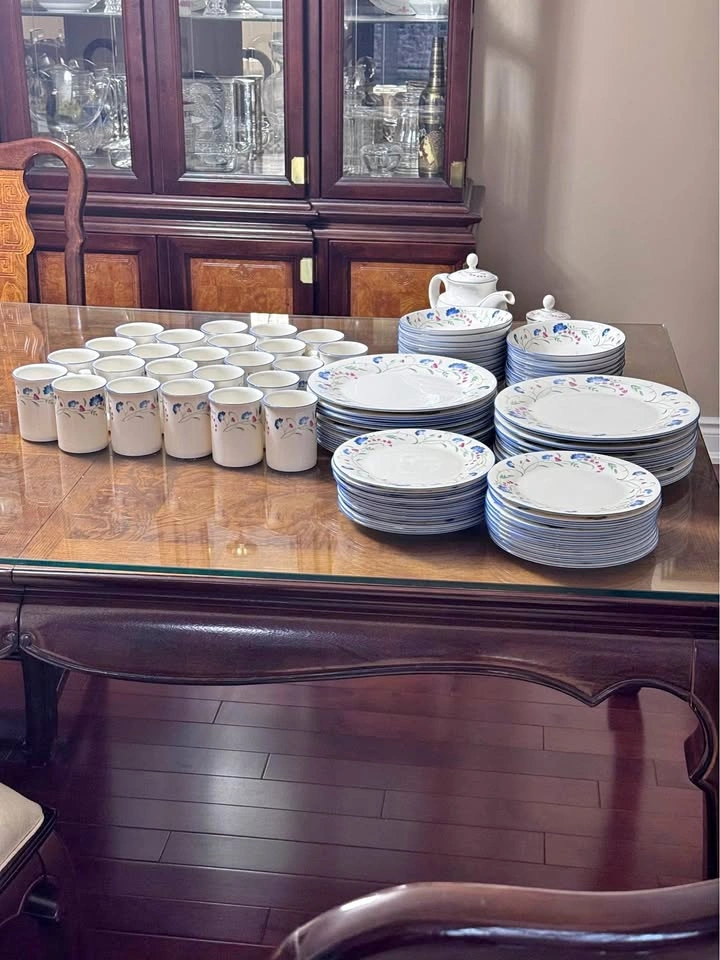 Bring timeless elegance to your dining table with this stunning vintage 90s bone china set. Each piece features a delicate floral design with soft pinks, blues, and greens along the edges, creating a classic and graceful look perfect for both everyday dining and special occasions. What’s Included: • 24 Dinner Plates • 24 Side/Salad Plates • 24 Soup/Serving Bowls • 24 Tea Cups • 1 Large Teapot with Lid • 1 Sugar Bowl with Lid (That’s a total of 98 pieces!) Features: • Genuine 1990s Bone China – lightweight yet durable • Elegant floral border design, timeless vintage charm • Perfect for large gatherings, entertaining, or as a collector’s set • Rare to find a complete set in such excellent condition Ideal for collectors, vintage lovers, or anyone looking to elevate their dining experience with a full, matching dinnerware set.