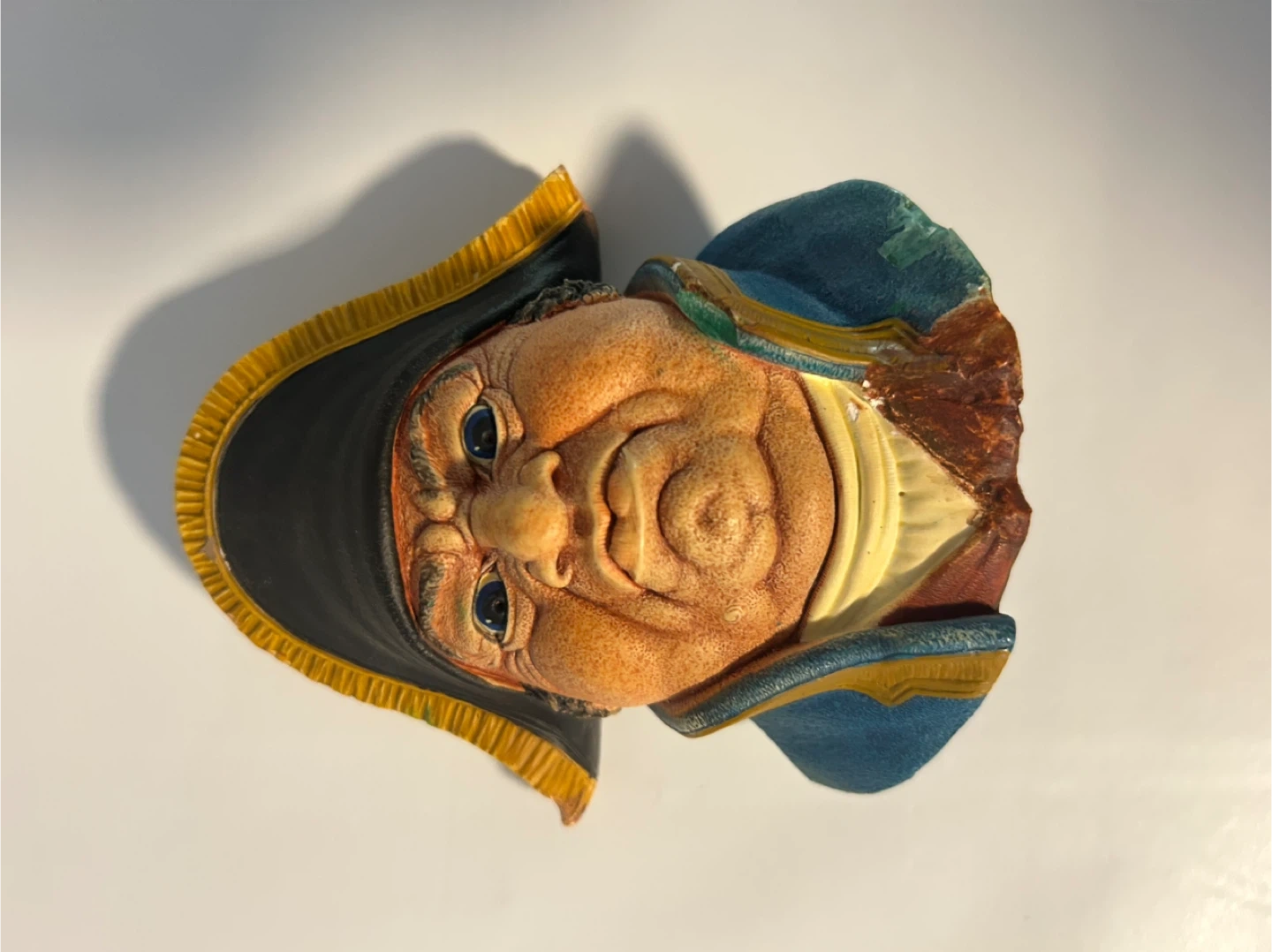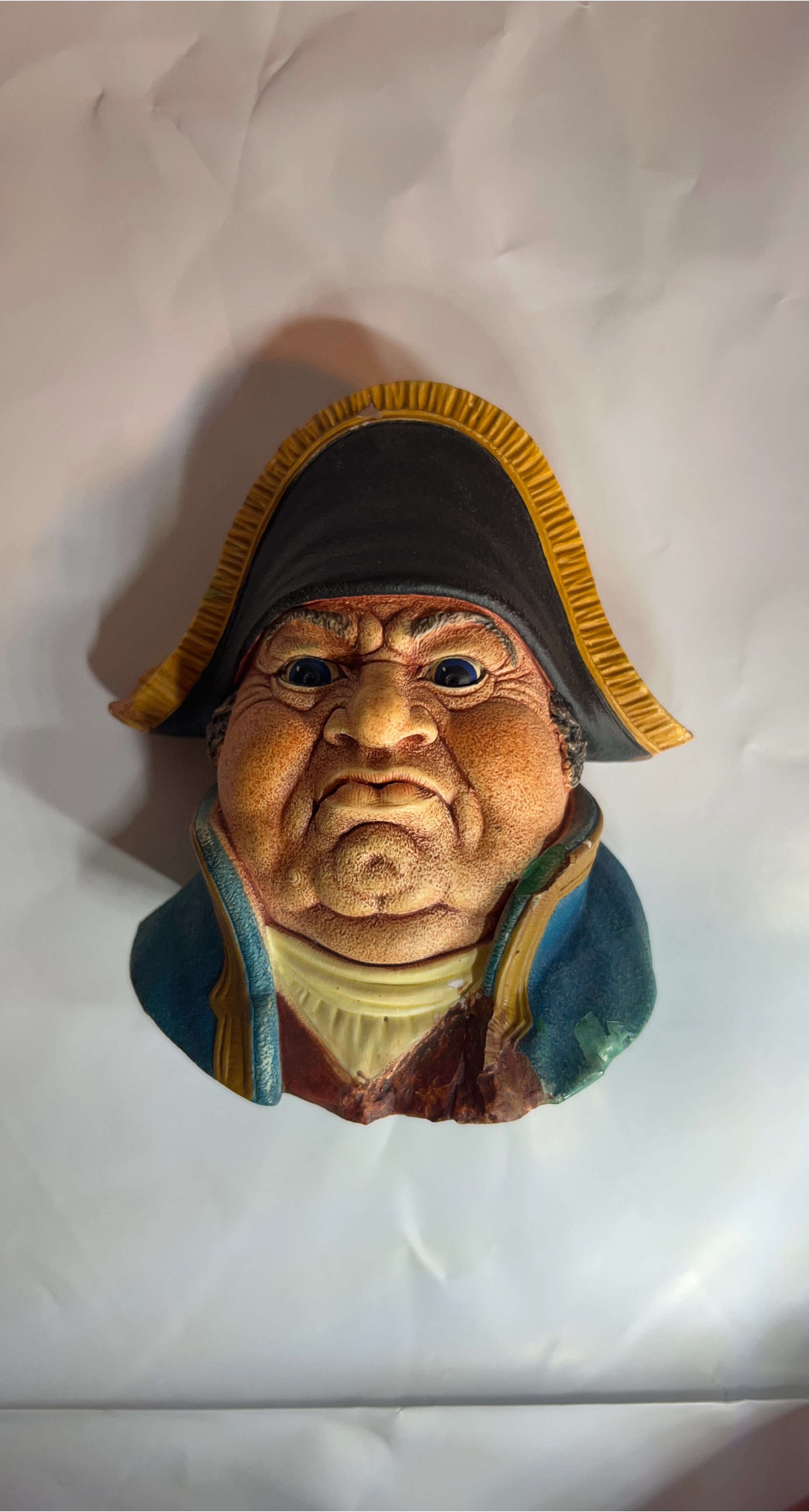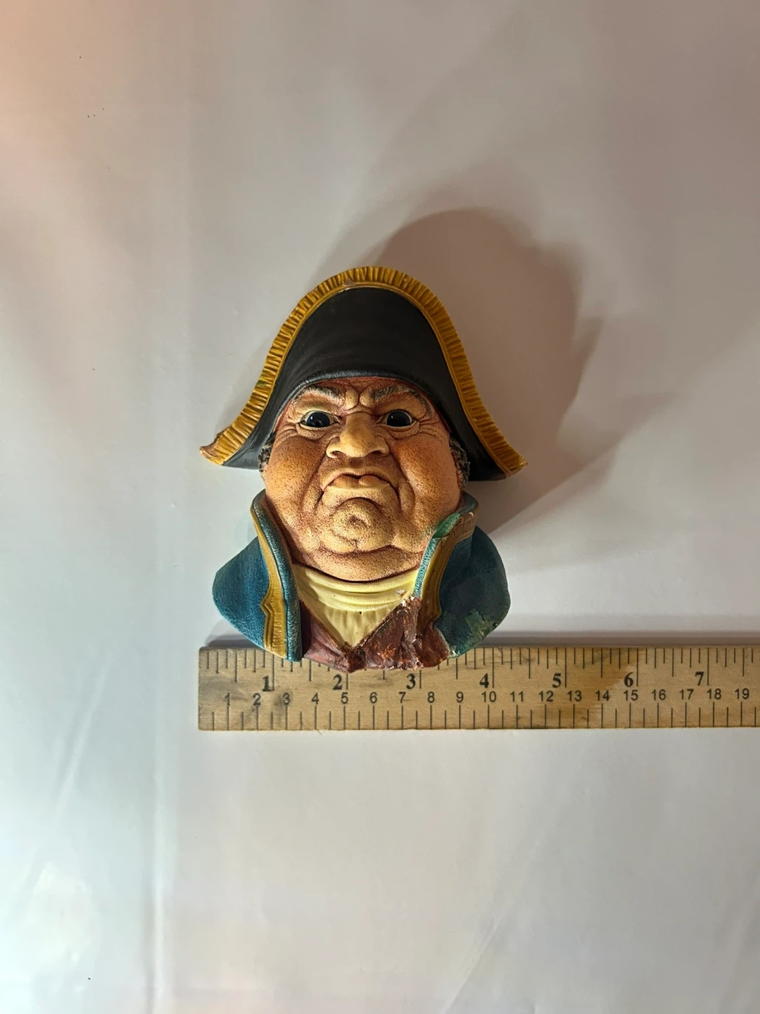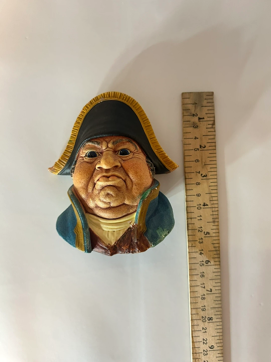 This is a vintage admiral character head, possibly a decorative piece or a unique item for collectors. It has a distinctive look with a stern expression and detailed facial features. The admiral is wearing a hat and coat, with a ruler in one of the photos for size reference. It would be a great addition to any collection