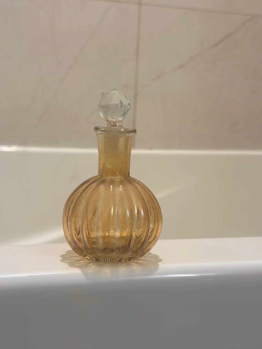 Selling a lovely vintage amber-coloured glass perfume bottle. It has a unique round shape with vertical ridges and a clear glass stopper. It would make a beautiful addition to any vanity or collection One of a kind