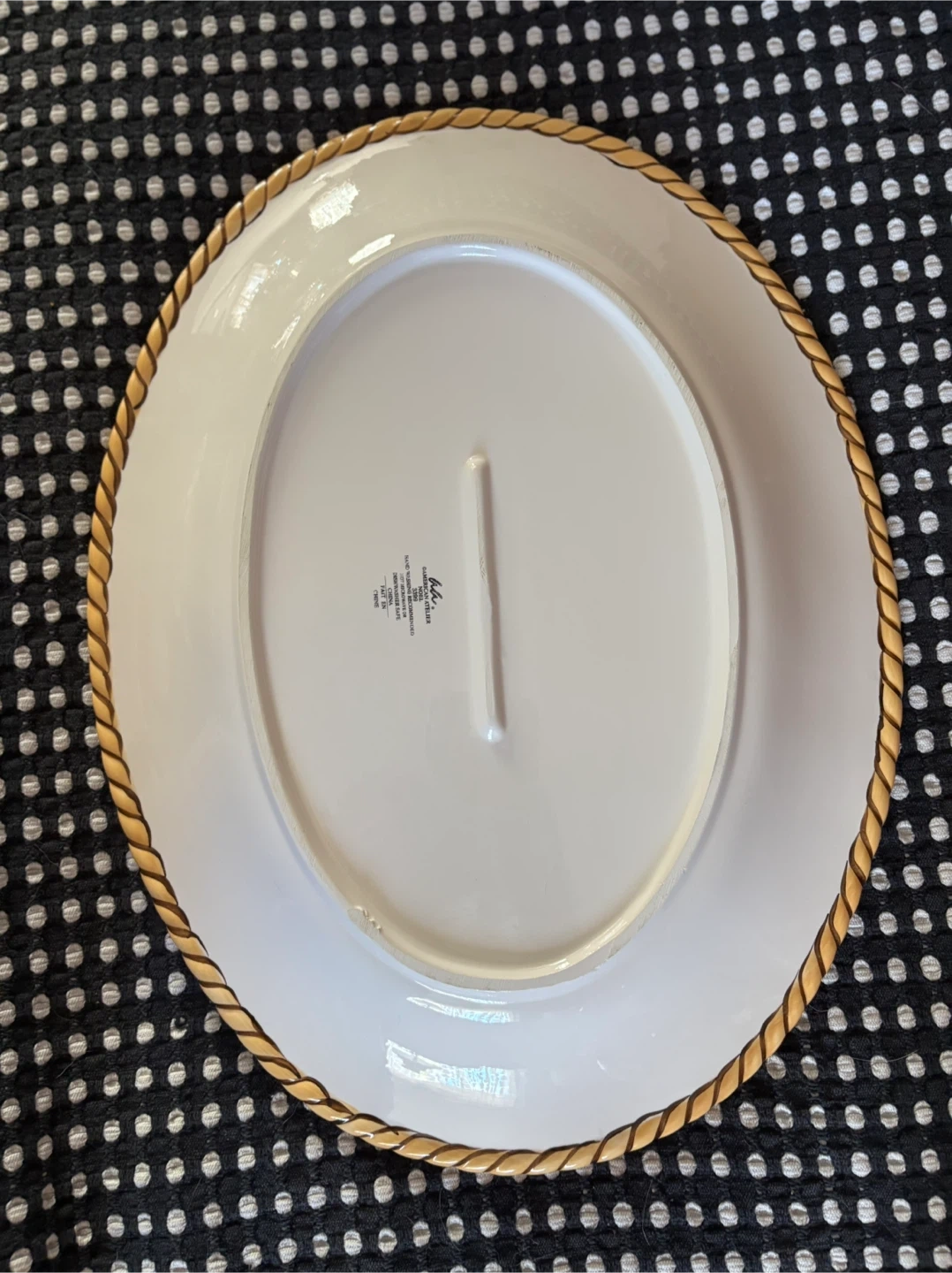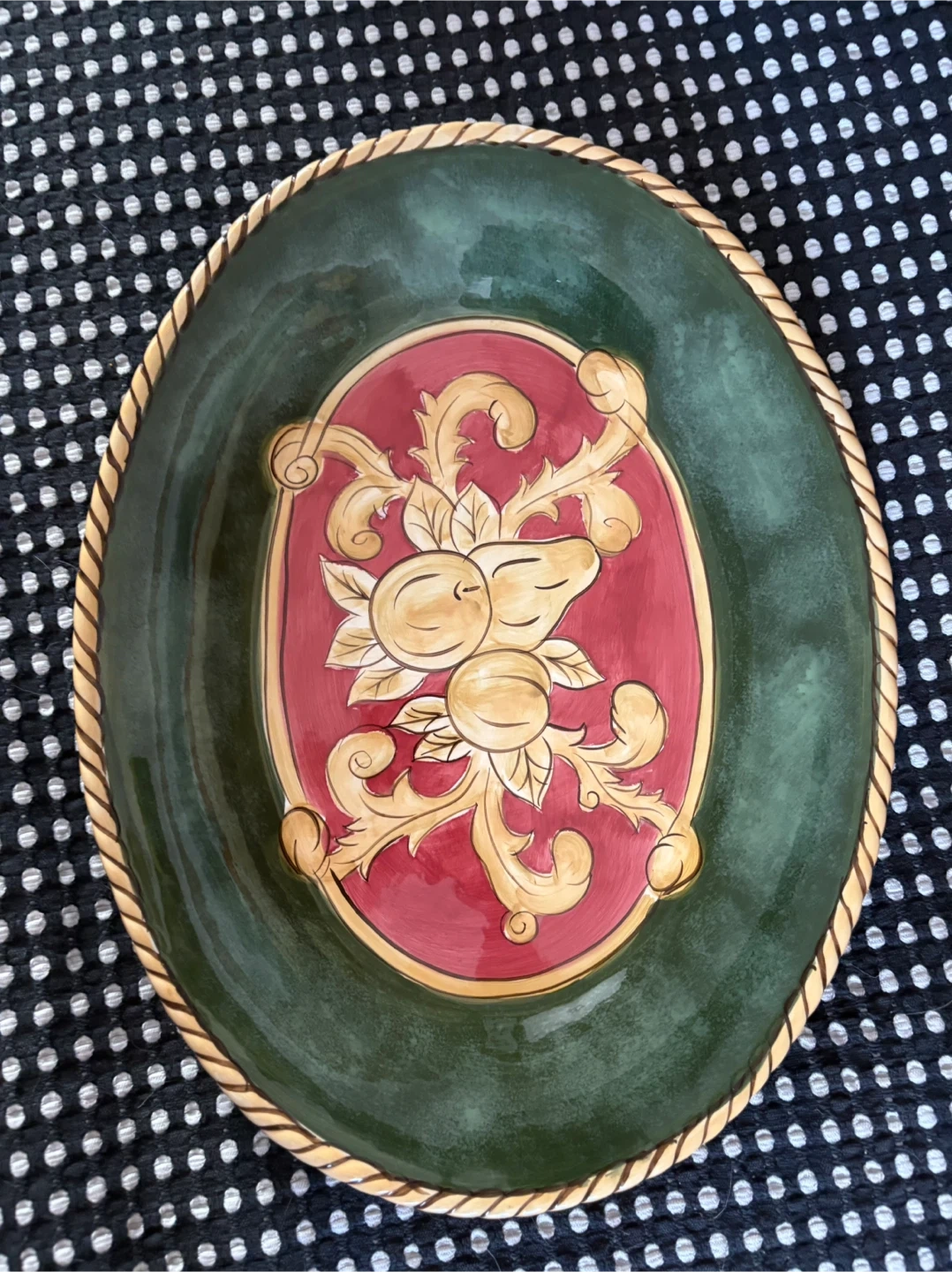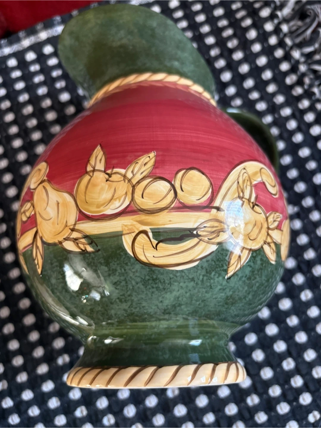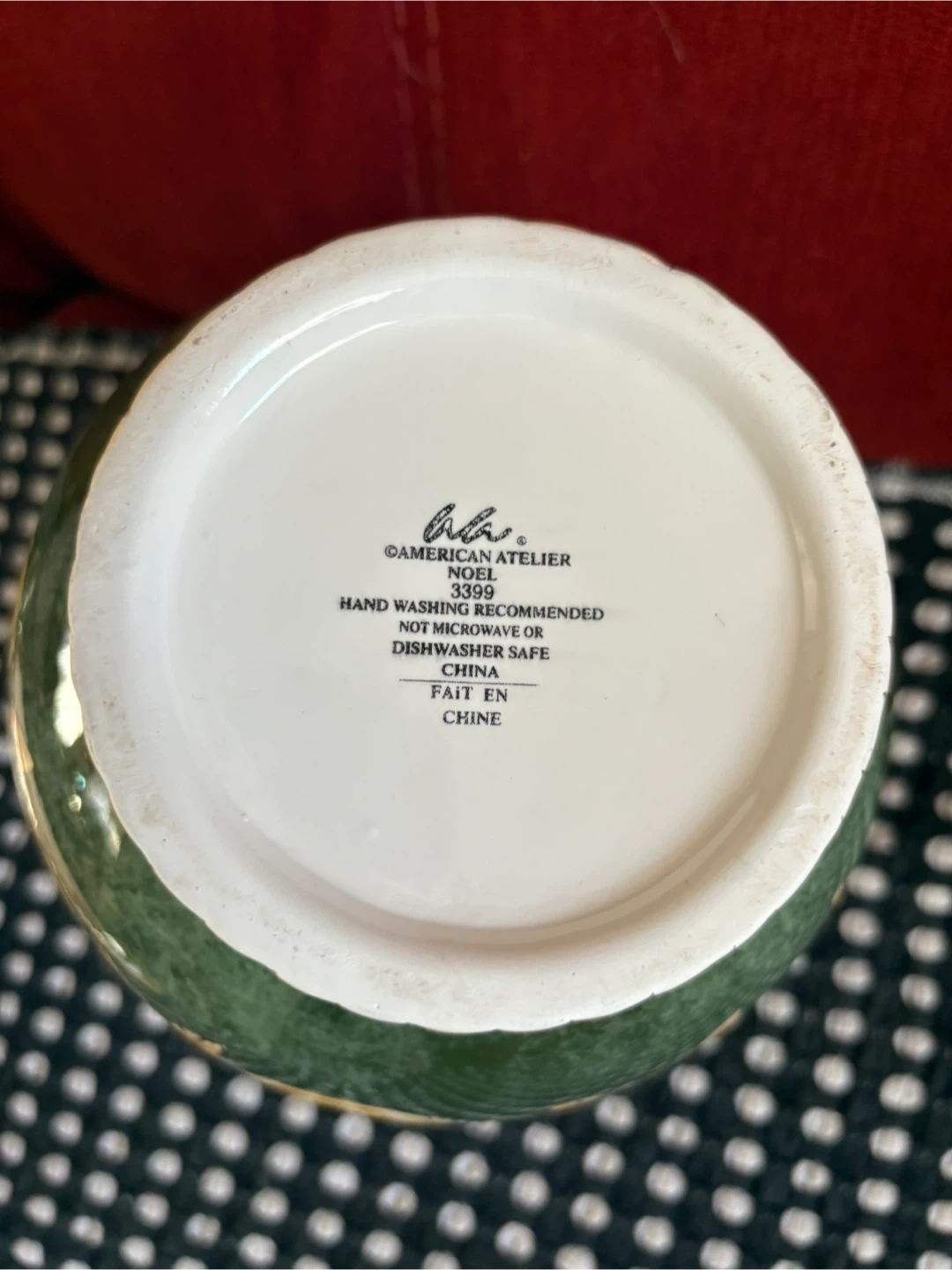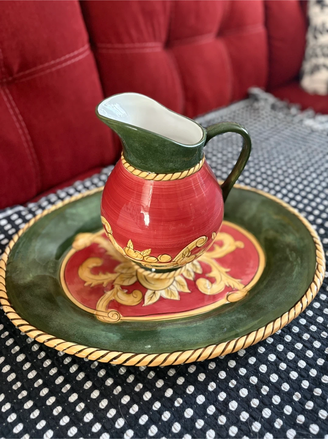 26Selling a lovely American Atelier Noel pitcher and platter set! The set features a beautiful design with red, green, and gold accents. Perfect for adding a touch of elegance to your table setting. Hand washing is recommended. EUC