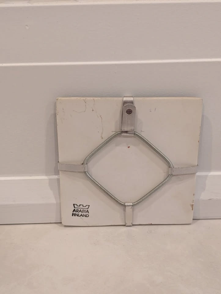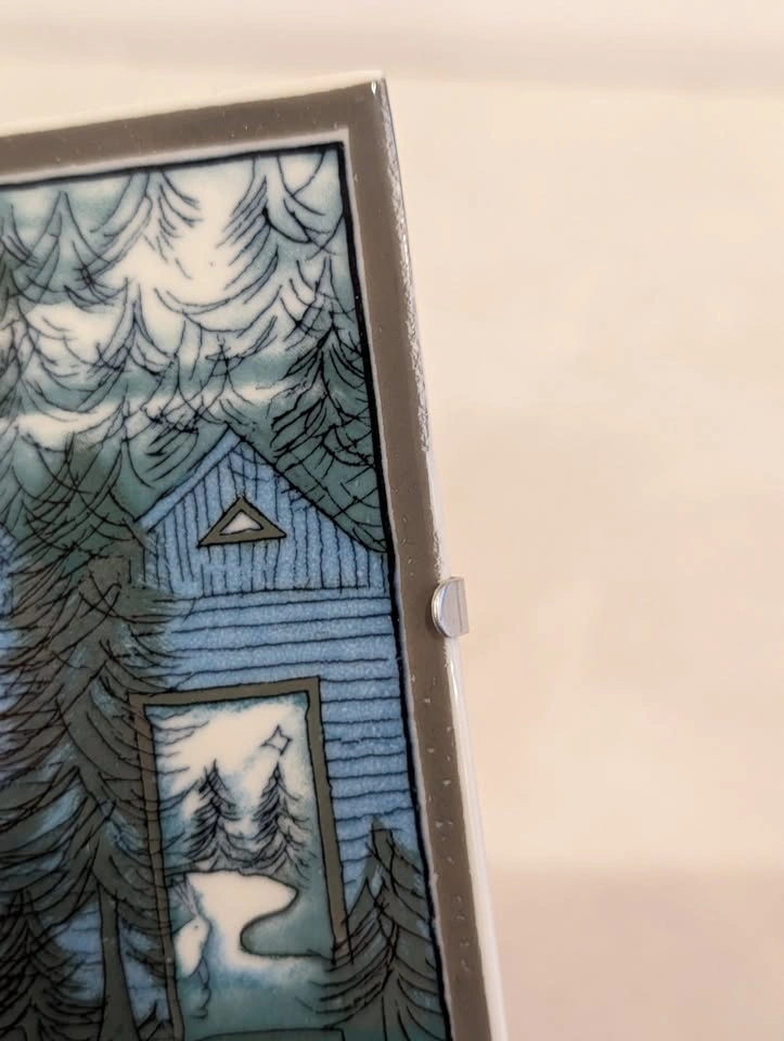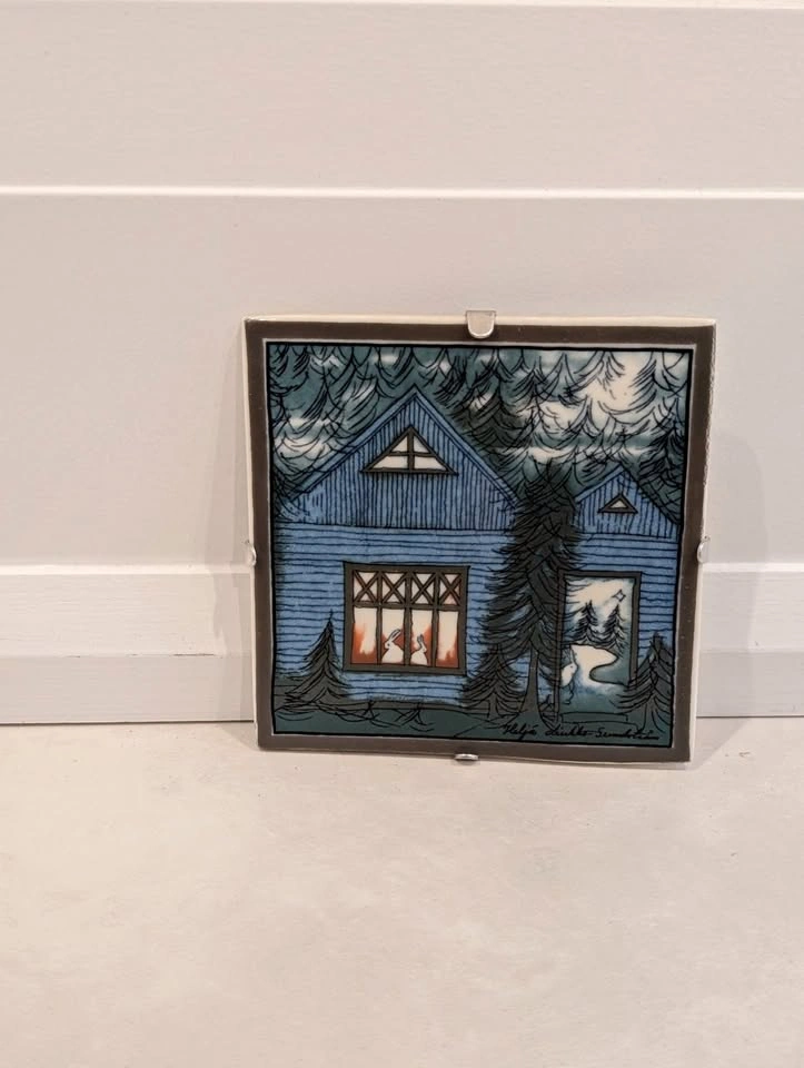 52Selling a beautiful, collectible vintage Arabia Finland ceramic wall tile titled "Sininen onnentalo" or "Blue House of Happiness" by the renowned Finnish artist Heljä Liukko-Sundström. This charming piece features a cozy blue house in a snowy, wooded setting, with bunnies visible through the main window, characteristic of Liukko-Sundström's playful yet serene style. Artist: Heljä Liukko-Sundström (signed on the front) Manufacturer: Arabia Finland Design Name: "Sininen onnentalo" (Blue House of Happiness) Year of Production: Likely produced between 1995 and 1999 Dimensions: Approximately 12 cm x 12 cm (approx. 4.5" x 4.5") Hanging: Comes with the attached metal wall hanger shown in the picture. A perfect item for collectors of Scandinavian design, Finnish art, or unique home decor.