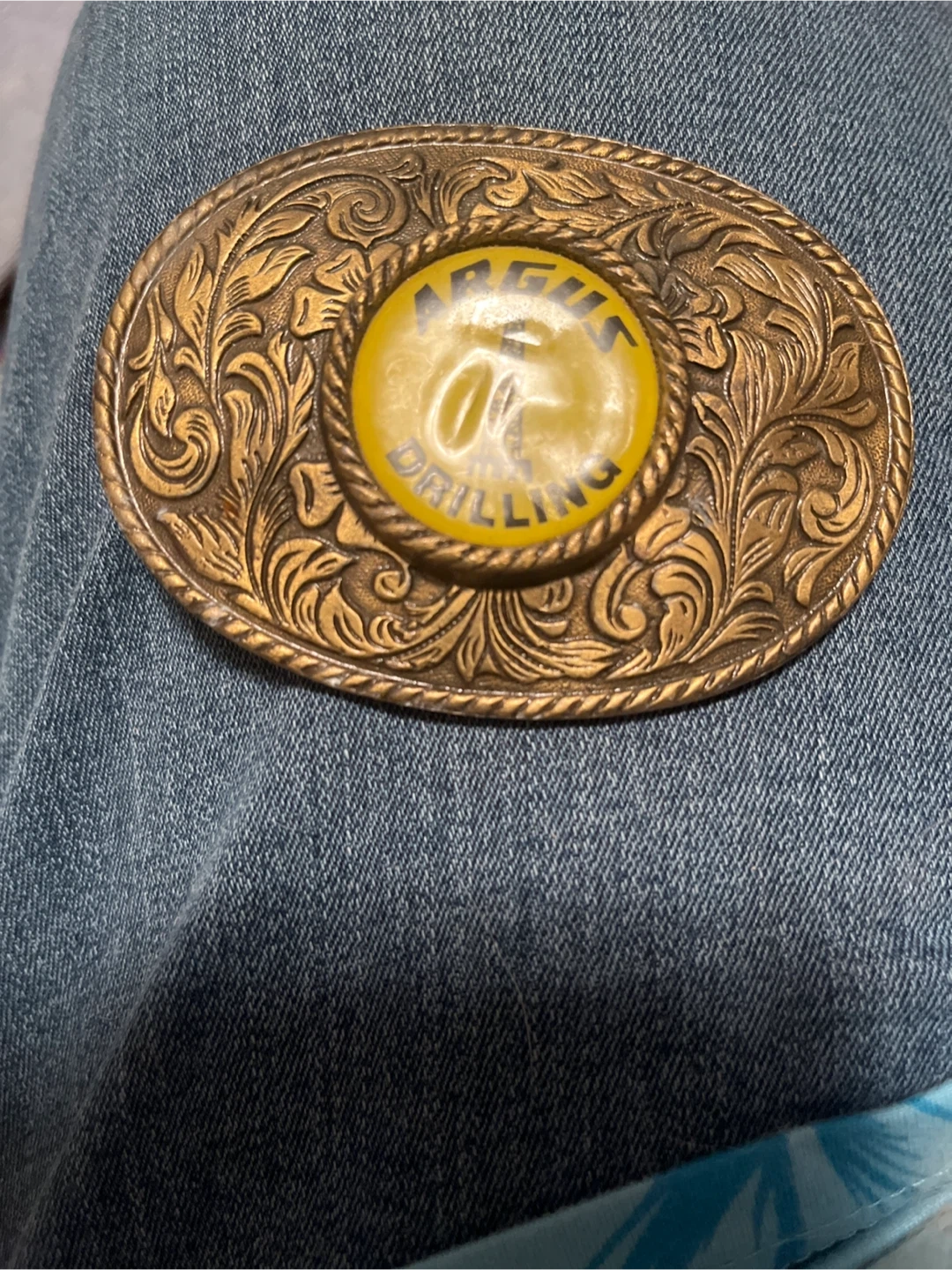 Selling a vintage Argus Drilling belt buckle. It has a unique design with floral patterns and a central logo. The back has some markings.