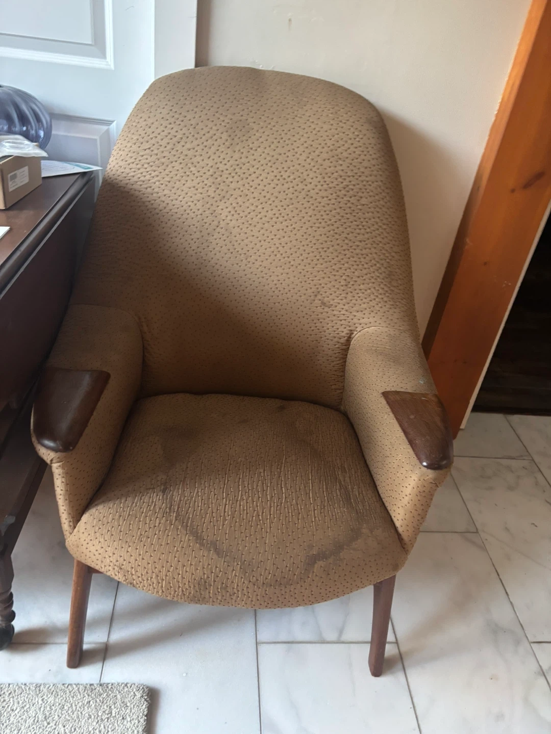 15Selling a vintage armchair with a unique brown fabric. It has wooden armrests and legs. The chair has some signs of wear, as pictured, but still has lots of life left in it. It’s a great for someone who can upgrade it . Perfect for adding a touch of retro charm to your home!