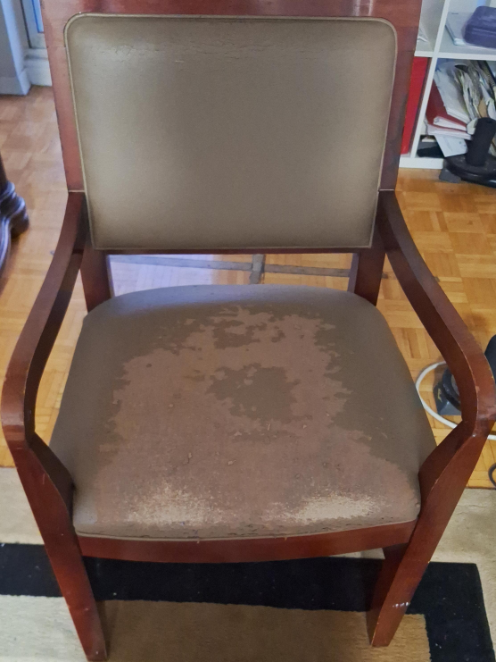 80Selling a vintage armchair. It has a wooden frame and a padded seat and back. There are some signs of wear on the seat, as pictured, but it's still a sturdy and comfortable chair for your home