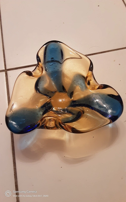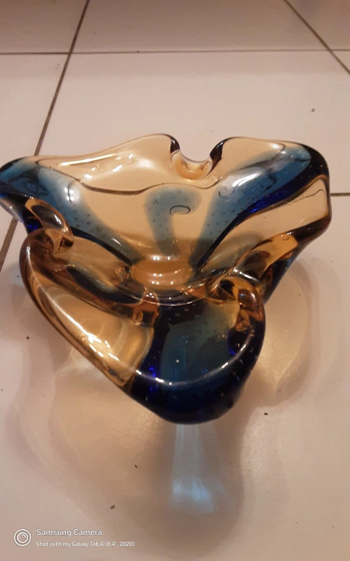 Selling a beautiful vintage art glass bowl. It features a unique design with amber and blue colours. This bowl would make a great addition to any home decor