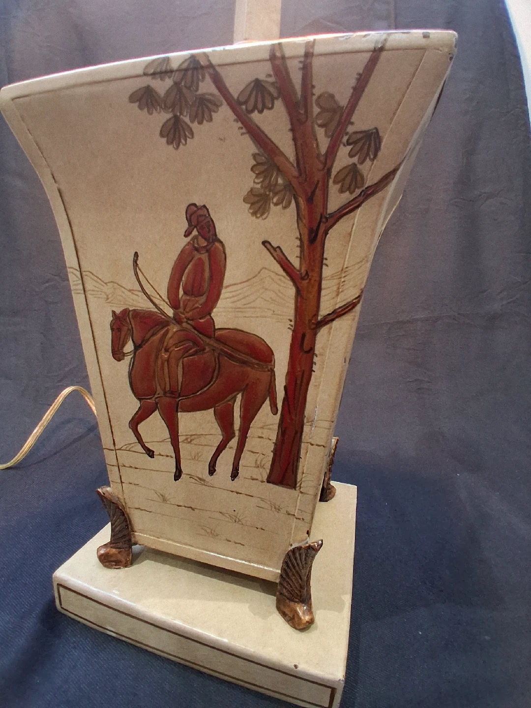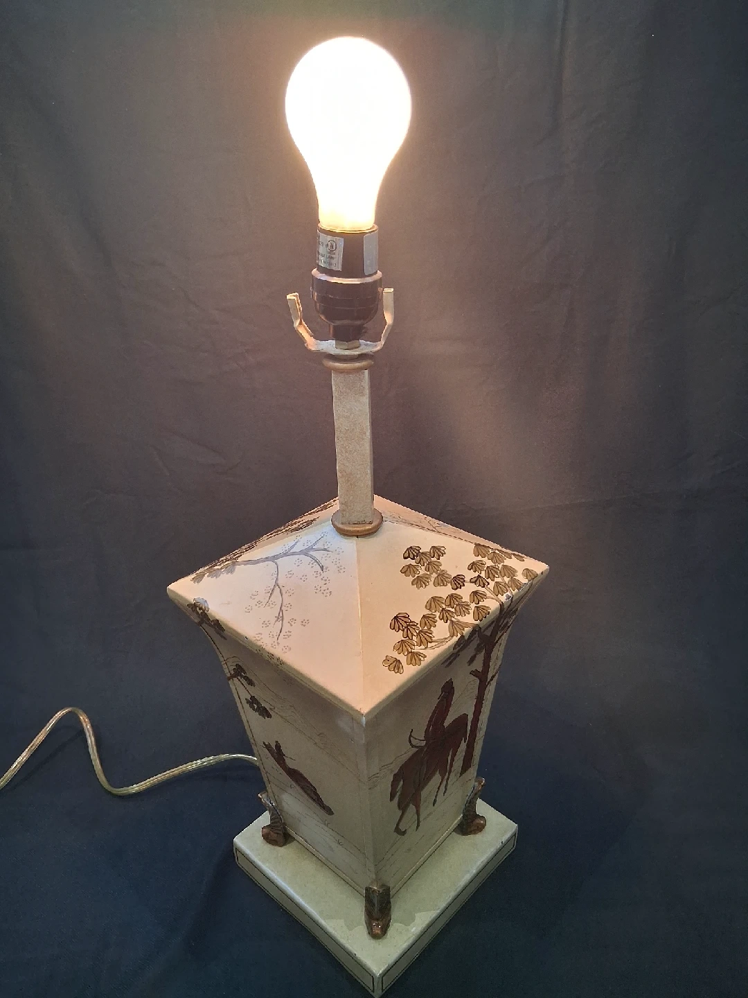 60Selling a unique vintage table lamp with an Asian-inspired design. It is missing the shade, but the electical is in great condition. It features detailed illustrations of people on horseback and in boats, adding a touch of vintage charm to any room. It's in great condition with the exception of a few scratches, ready to brighten up your space!