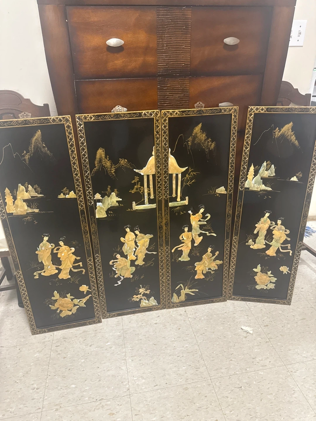 168Beautiful vintage Asian lacquer folding screen, perfect as a room divider or decorative piece! Features intricate mother-of-pearl inlays depicting traditional scenes. Adds an elegant touch to any room!