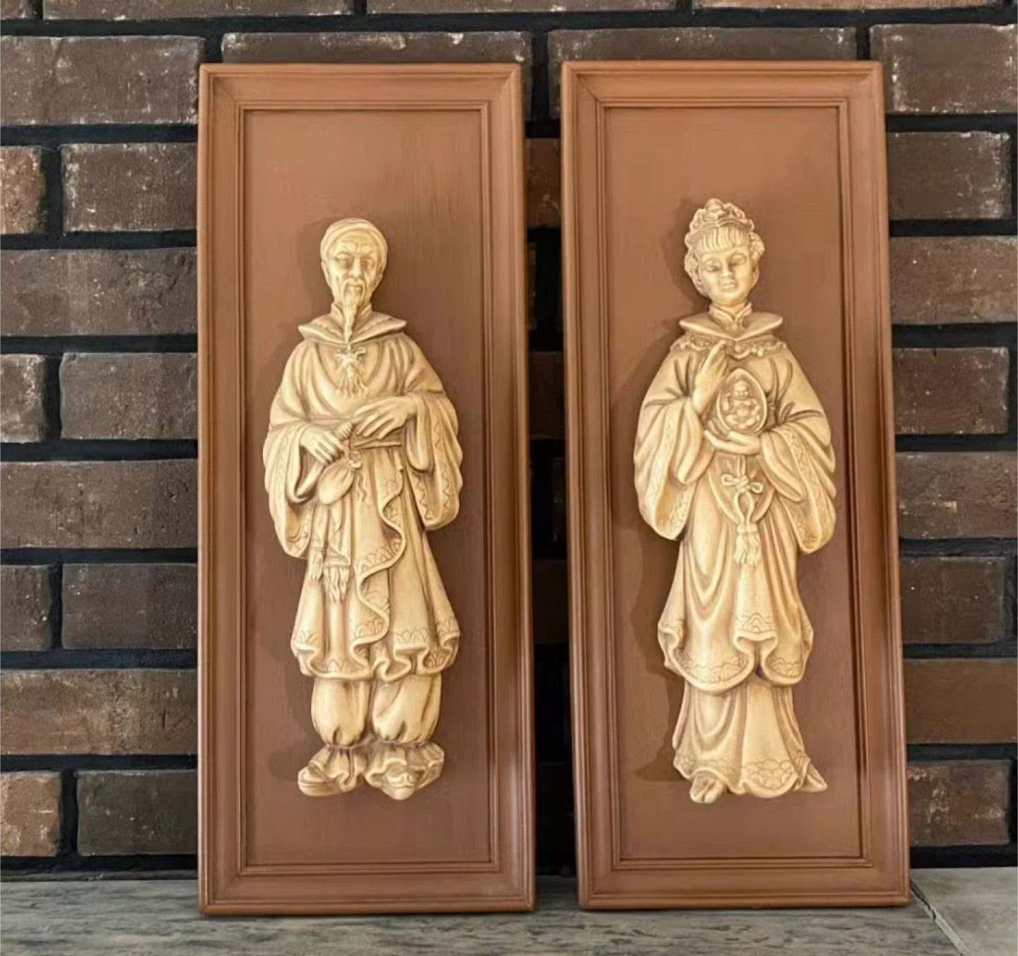 Selling a set of vintage Asian-inspired wall art plaques. These charming pieces feature detailed figures in traditional attire, set against a brown backdrop with a matching frame. Perfect for adding a touch of cultural elegance to your home decor!