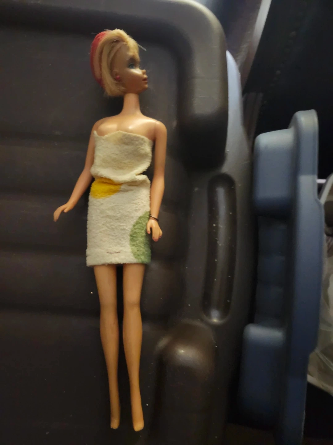 10Selling a vintage Barbie doll. She's wearing a dress with yellow and green accents. A great addition to any collection!