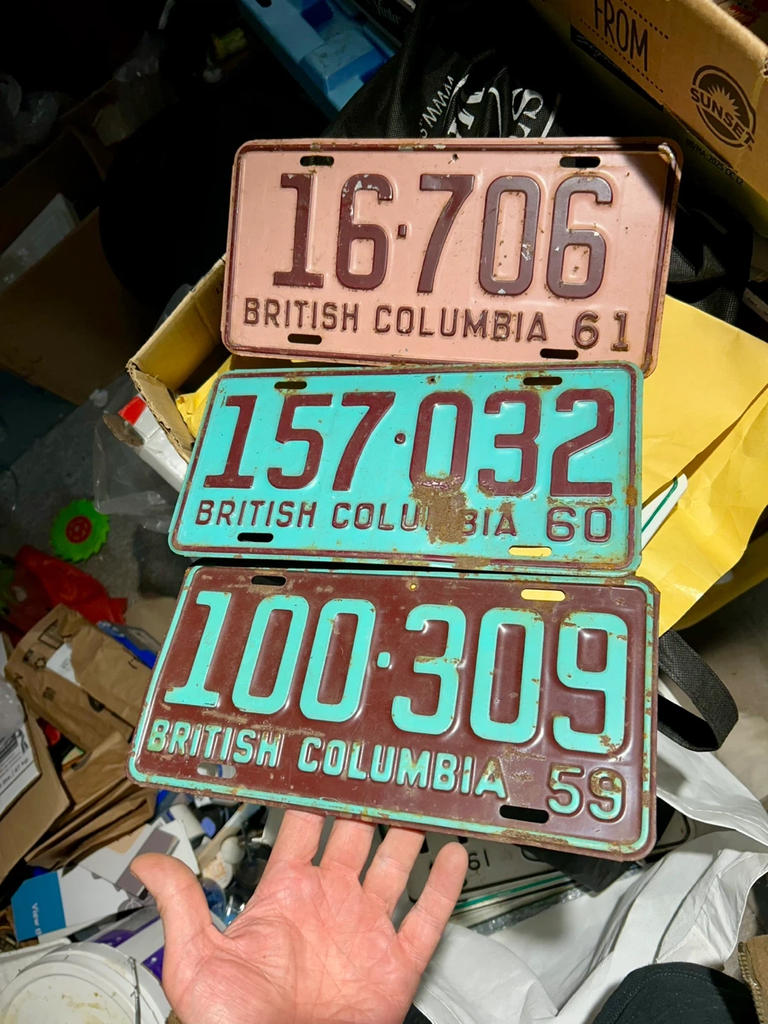 18Selling three vintage British Columbia license plates: - 1961 plate numbered 16-706 - 1960 plate numbered 157-032 - 1959 plate numbered 100-309 These plates would be great for a collector or for decorative purposes! $20 each