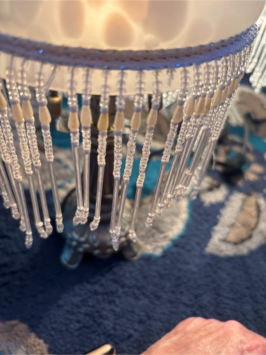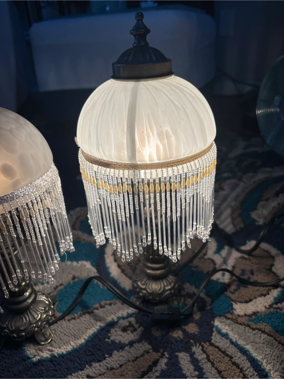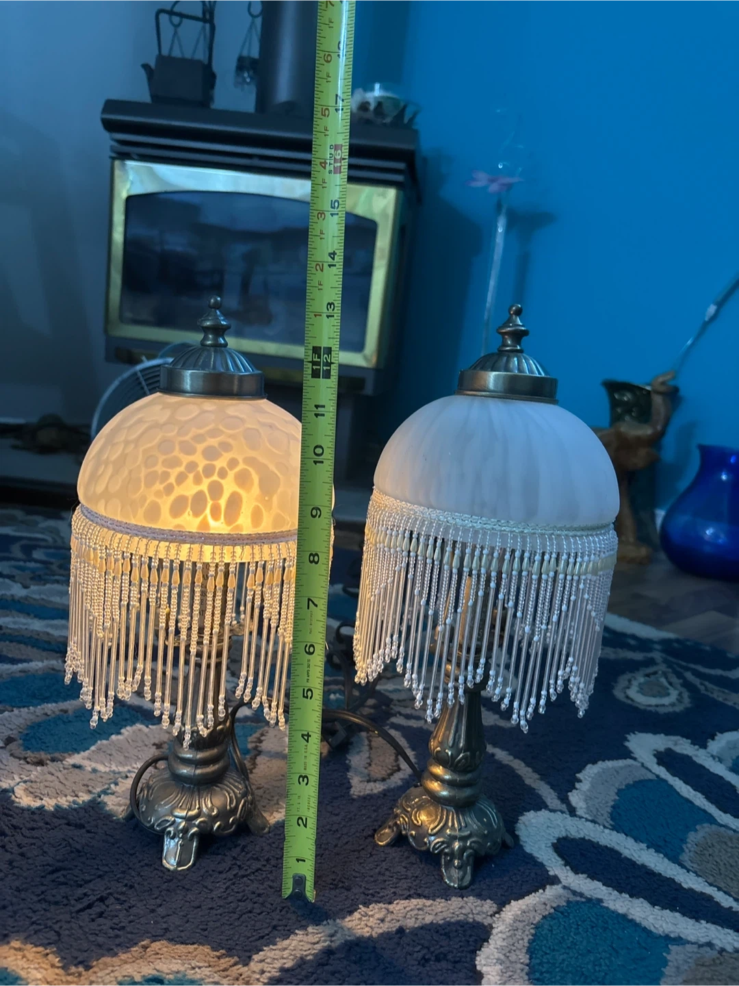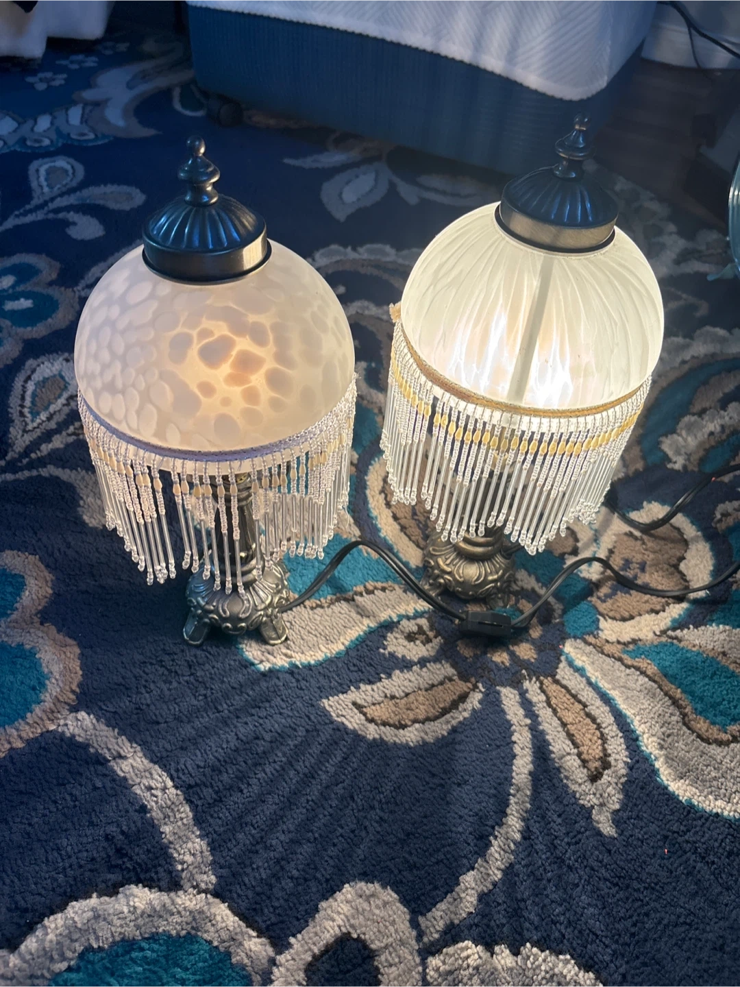 21Selling a pair of metal vintage-style boudoir lamps with beaded fringes and frosted glass shades! One is slightly taller and slight different shade pattern. Some beading is missing and one switch is broken but lamp still works. Easily fixable. Sells elsewhere for $100 each asking $65 each or $110 for both.