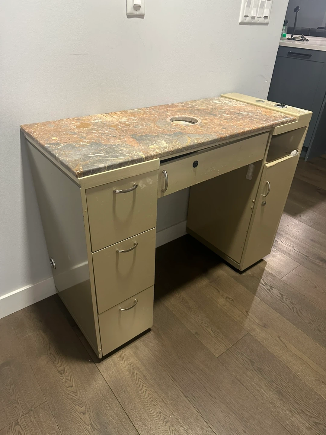 10Selling a unique vintage nail desk! It features a beige-coloured frame with a distinctive marble-patterned top. It has a set of drawers on one side and a cabinet on the other, offering ample storage space. Perfect for people who are starting nail salon at home