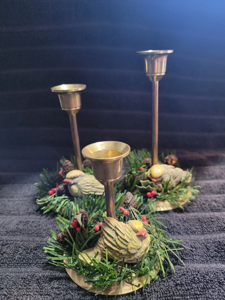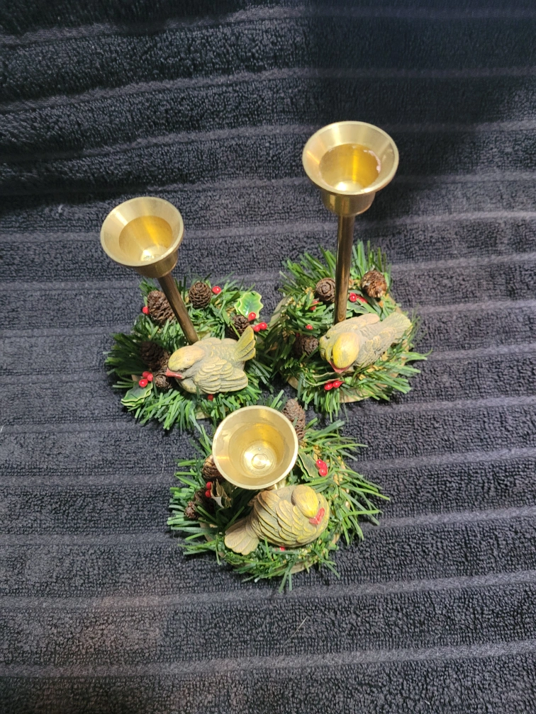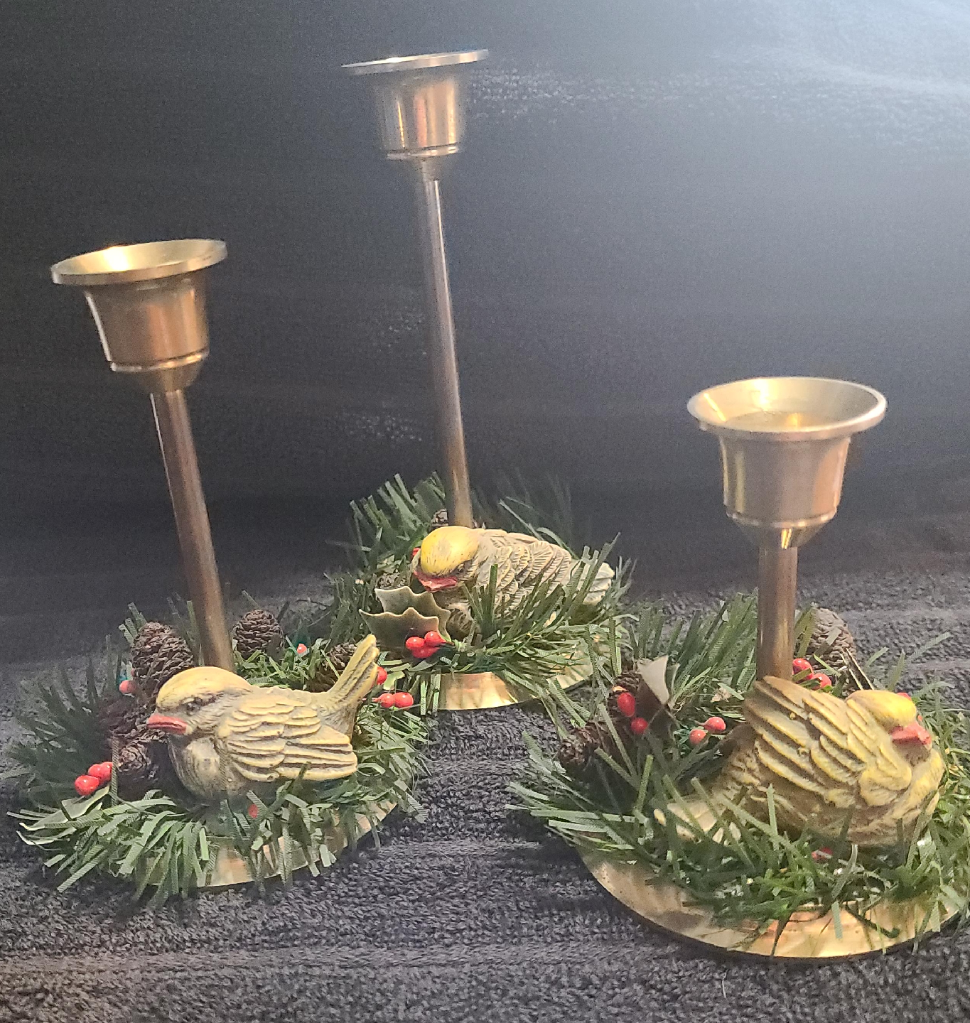 10Here's a set of three vintage charming candle holders! Each features a little bird nestled in a festive wreath. They'd be perfect for adding a touch of whimsy to your holiday decor or any time of year