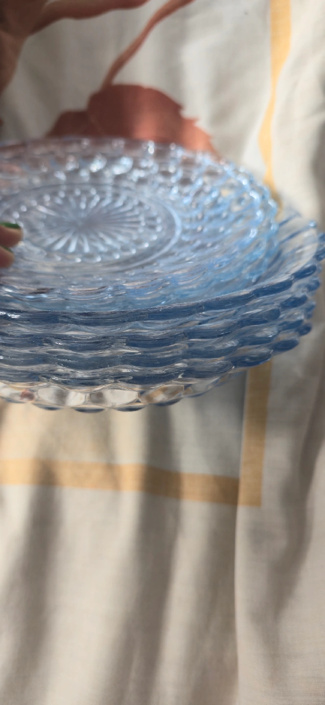 Selling a set of vintage blue glass plates. They have a lovely, delicate design and are in great condition. Perfect for adding a touch of retro charm to your table setting!