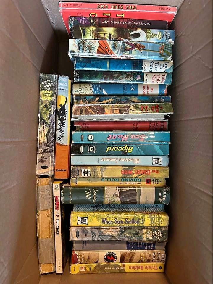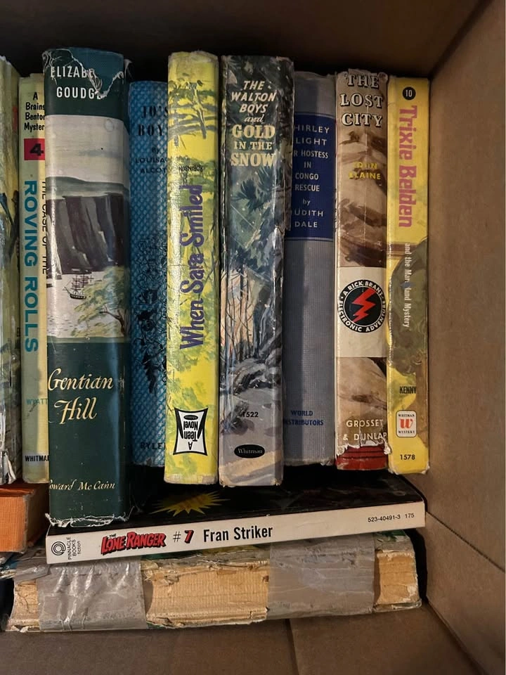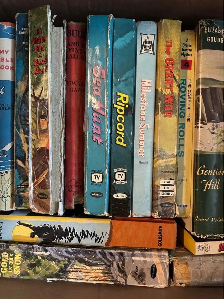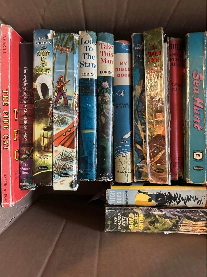 Selling a mixed box of vintage books, mostly mid-20th century, including Whitman hardcovers, TV tie-ins, teen/YA adventure, Zane Grey westerns, and other collectible titles. These are the kind of books that appeal to collectors, nostalgia hunters, or anyone looking for display-worthy vintage spines with that classic mid-century look. Some of the titles visible in this box include (but not limited to): • The Fire Cat • The Mystery of the Vanishing Lady • The Spirit of the Border (Zane Grey) • Treasure Island • Look to the Stars / Take This Man (Loring) • My Bible Book • Tom Sawyer • The Walton Boys series (Rapids Ahead, Gold in the Snow) • Buddy and His Flying Balloon • Sea Hunt • Ripcord • Milestone Summer (Teen Novel) • The Great War (Real Life Stories, Whitman) • Brains Benton Mystery: The Case of the Roving Rolls • Gentian Hill (Elizabeth Goudge) • When Sara Smiled • The Lost City (Rick Brant Science Adventure) • Trixie Belden and the Mark on the Mirror (#10) • The Lone Ranger (#7, Fran Striker) Condition: These books range from fair to rough condition — some have wear, cracked spines, or taped repairs. Others are sturdier and better preserved. Please look closely at the photos to confirm titles and condition. I’ve listed them to the best of my ability, but I may have missed or misread some, so the photos are your confirmation. Perfect for collectors, crafters, or anyone who loves vintage YA/children’s/adventure fiction. Selling as a box, no cherry picking. 📍 Pickup with cash or e-transfer at 310 25th St W.