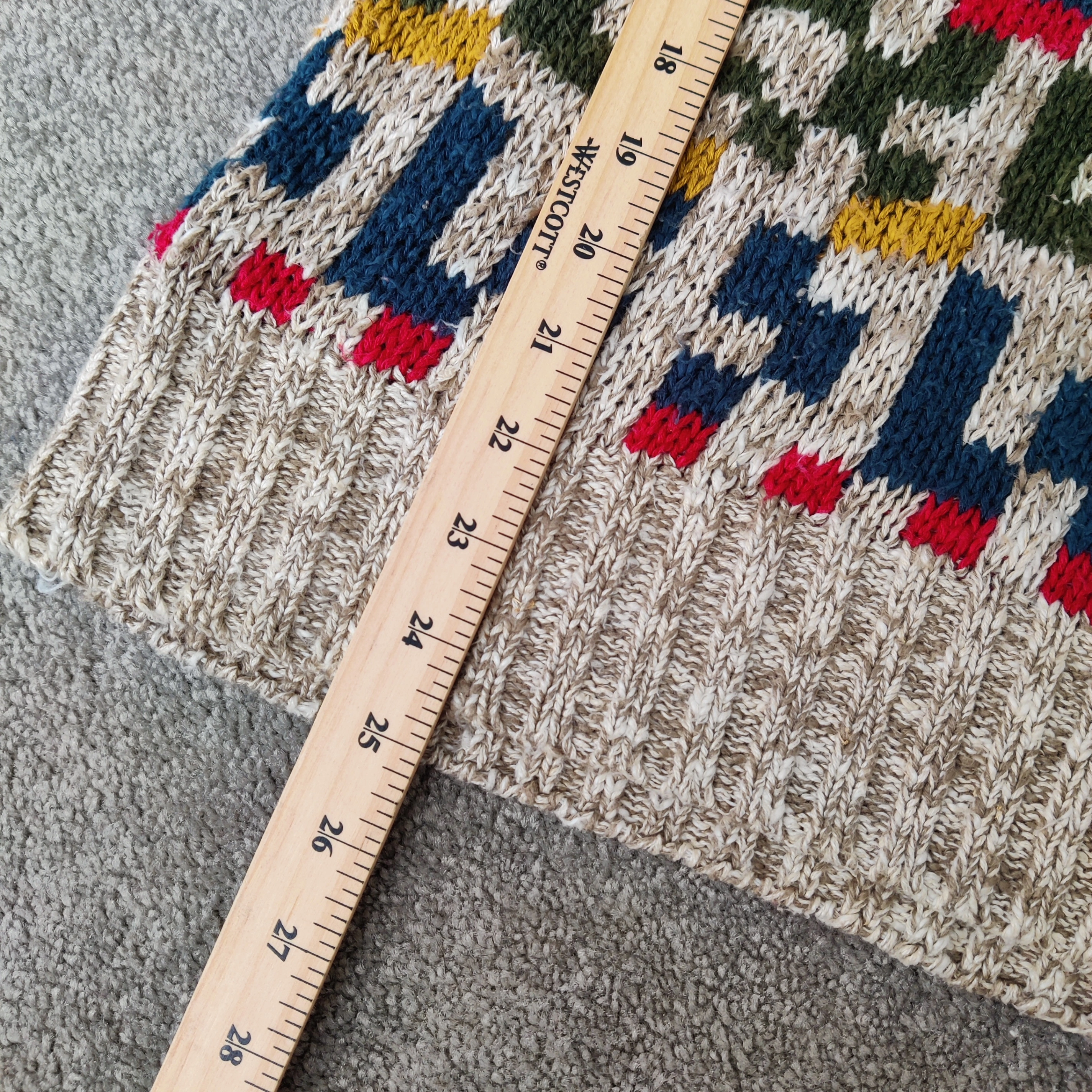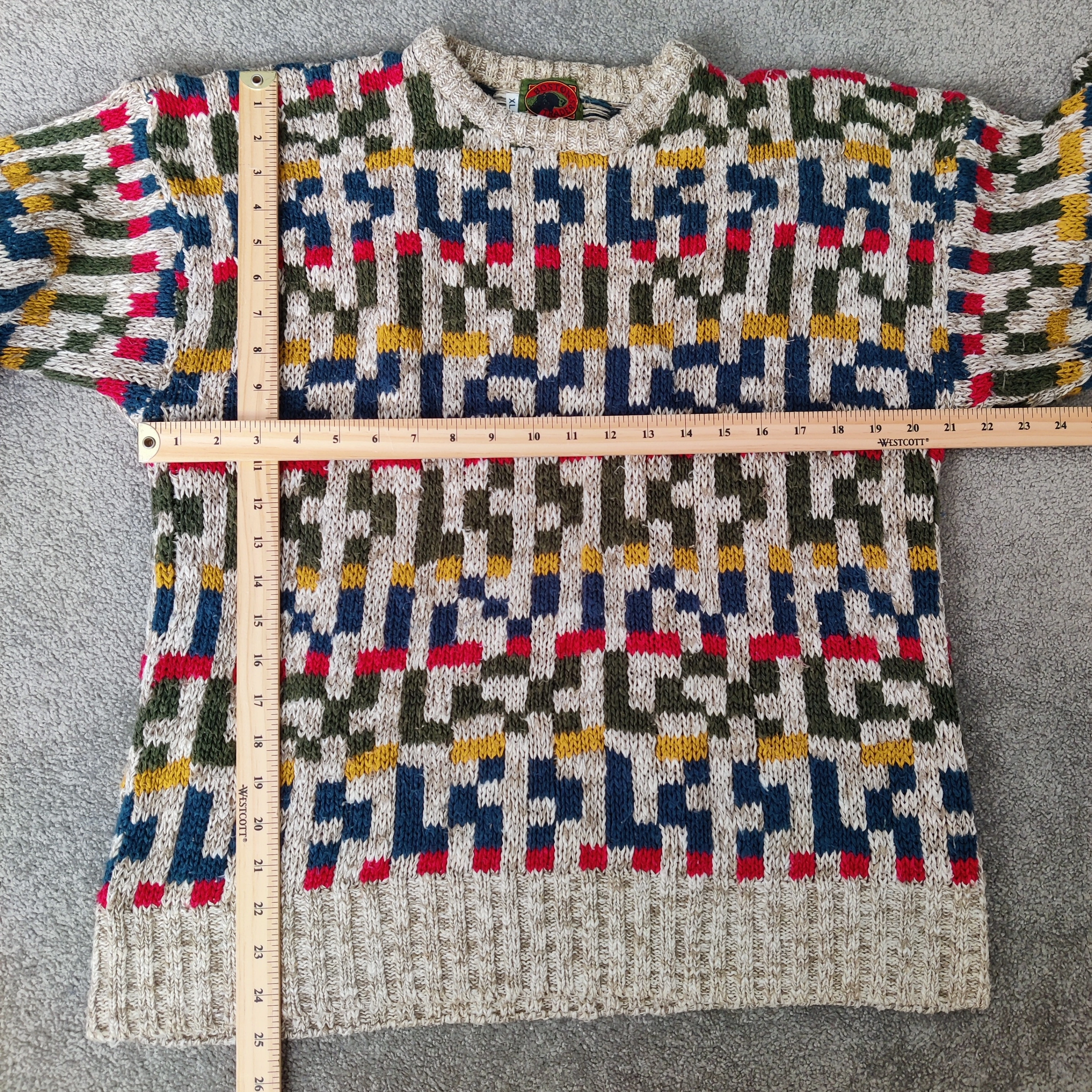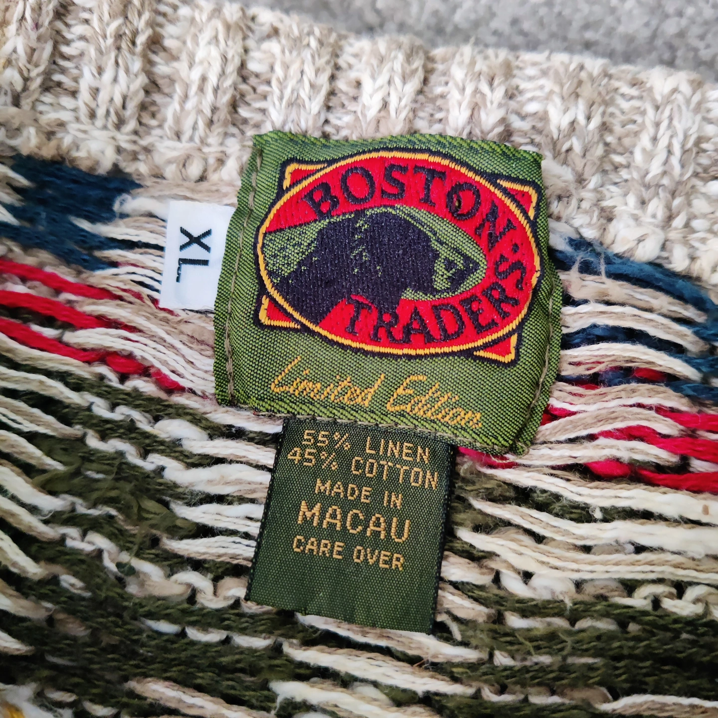 Linen Cotton Multicolor Retro Pattern In good used condition GUC Measurements are approximate and taken laying flat Follow me on Instagram @renewifyupcycle for unique upcycled items Boston Traders sweater, vintage knit sweater, XL men’s sweater, linen cotton sweater, retro geometric sweater, 90s style sweater, multicolor knit, crewneck vintage sweater, limited edition Boston Traders, made in Macau sweater
