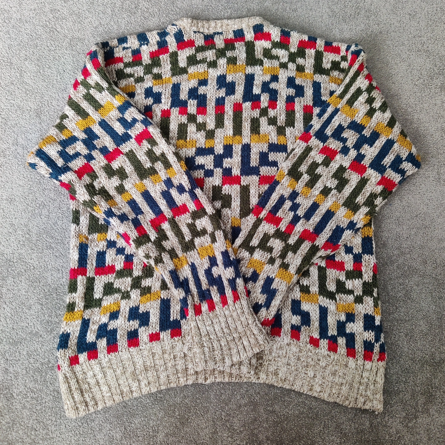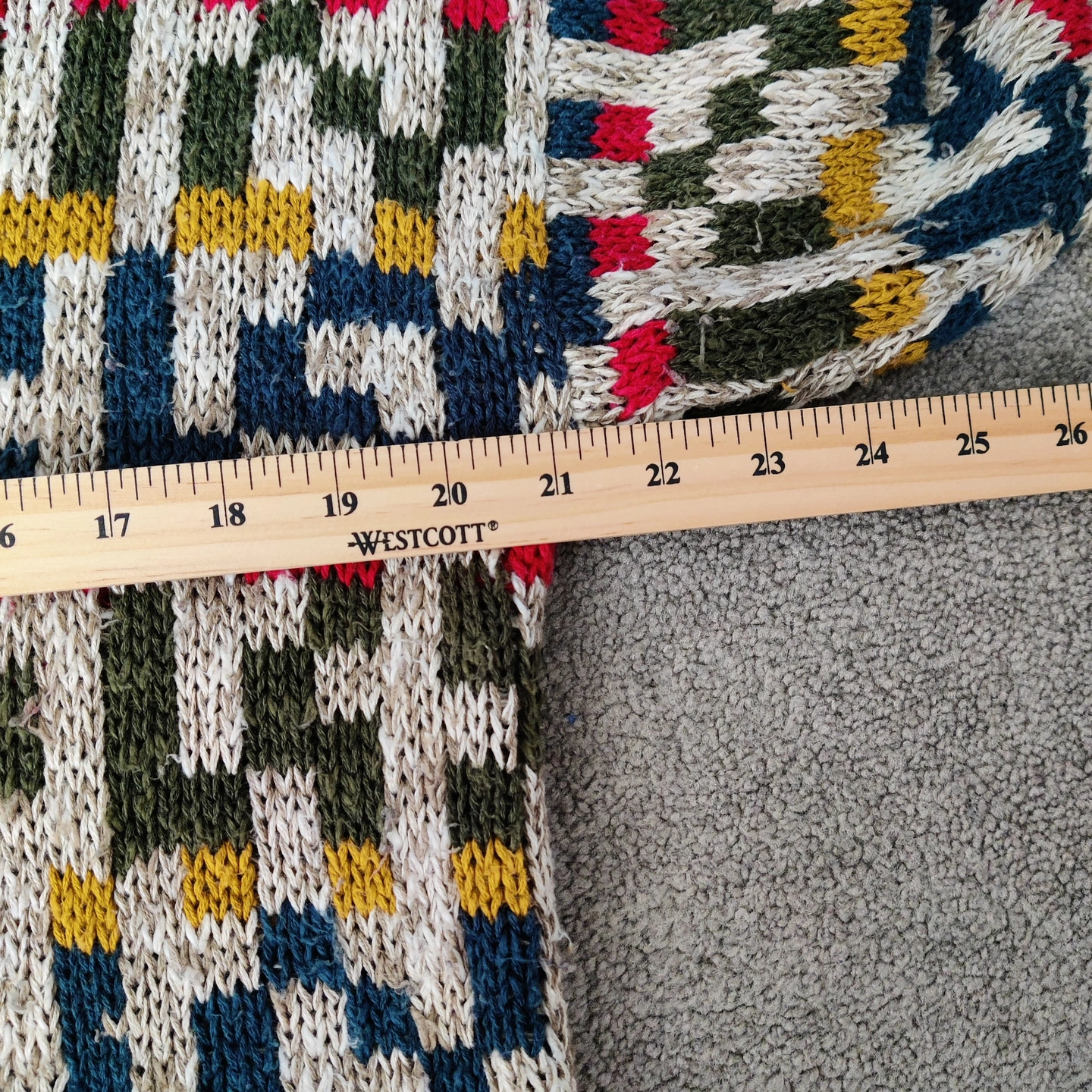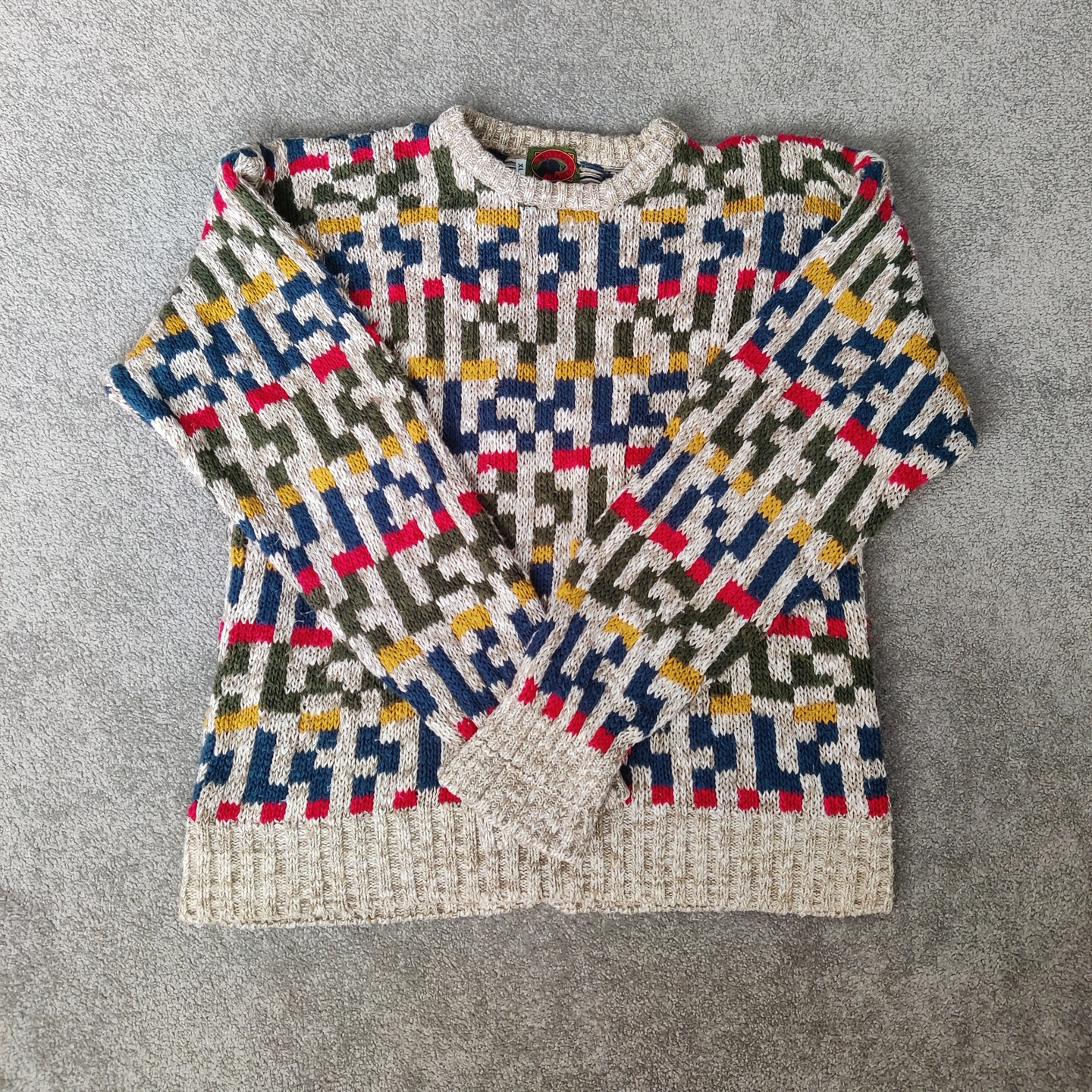 Linen Cotton Multicolor Retro Pattern In good used condition GUC Measurements are approximate and taken laying flat Follow me on Instagram @renewifyupcycle for unique upcycled items Boston Traders sweater, vintage knit sweater, XL men’s sweater, linen cotton sweater, retro geometric sweater, 90s style sweater, multicolor knit, crewneck vintage sweater, limited edition Boston Traders, made in Macau sweater
