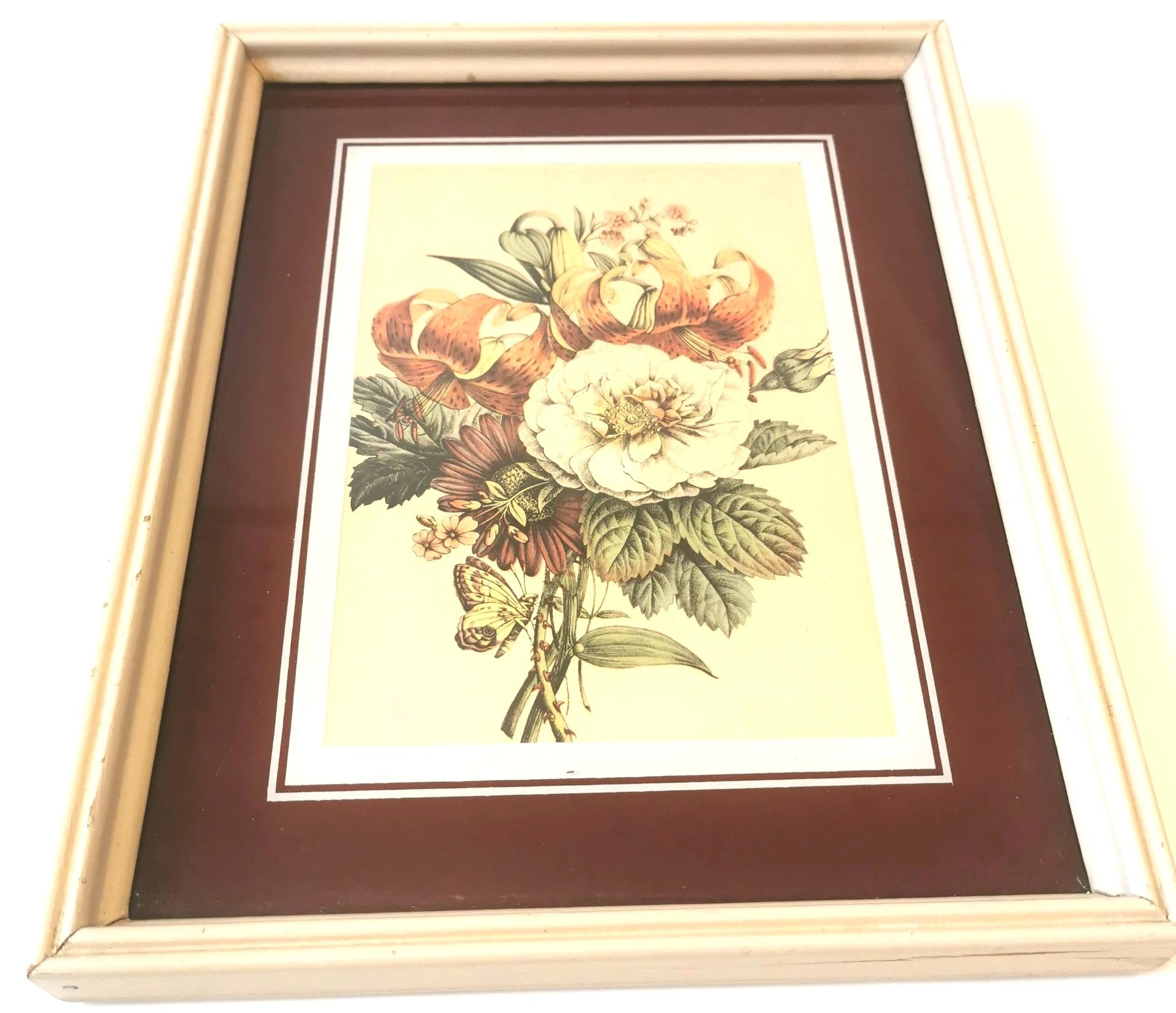 62Charming Vintage Botanical Floral Print in Wood Frame This beautiful vintage print captures a classic botanical arrangement, perfect for adding a touch of rustic or cottagecore charm to any space. The print features a vibrant bouquet of flowers, including prominent orange Tiger Lilies and a large White Rose, accompanied by a small butterfly. The color palette—with the rich floral tones set against a cream background and a deep burgundy/maroon matte—is typical of home decor from the mid to late 20th century. Artwork Details: Subject: Botanical Bouquet with Tiger Lilies, White Rose, and Butterfly. Era: Vintage, likely late 1950s. Style: Traditional Botanical Illustration Reproduction. Frame: Original light-colored wood frame with a dark interior mat (maroon/burgundy). Aesthetic: Cottagecore, Grandmillennial, Traditional, Vintage Farmhouse Decor. Condition: Good vintage condition. The print colors are bright. The frame shows age-appropriate wear with some minor chips or scuffs to the wood and rear paper which is common for a piece of this era and adds to its vintage character. Dimensions: 8.75 inches in width, 10.75 inches in length, and 1 inch in height