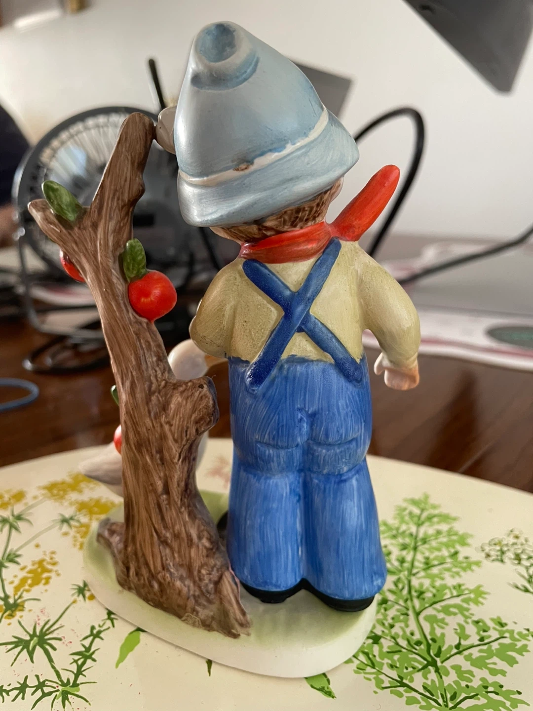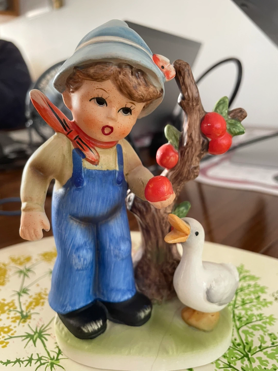 Selling a vintage figurine of a boy with a duck and an apple tree. It's in great shape and would look lovely on a shelf or mantle. It's a charming piece for collectors or anyone who appreciates vintage decor!