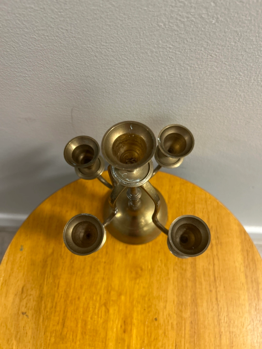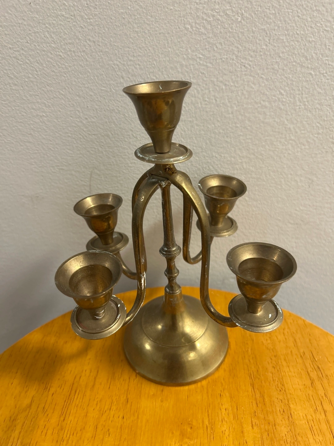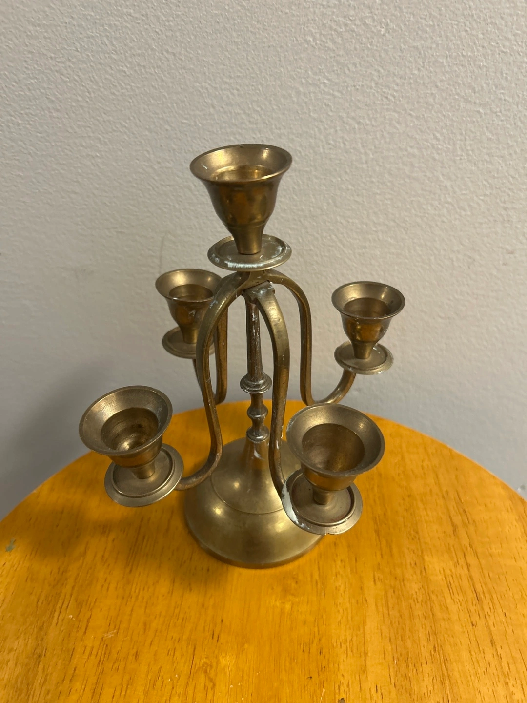A beautiful vintage brass candelabra that holds five candles. It's a lovely piece to add a touch of elegance to any room. It shows some signs of age, but is still in great condition and ready to use!